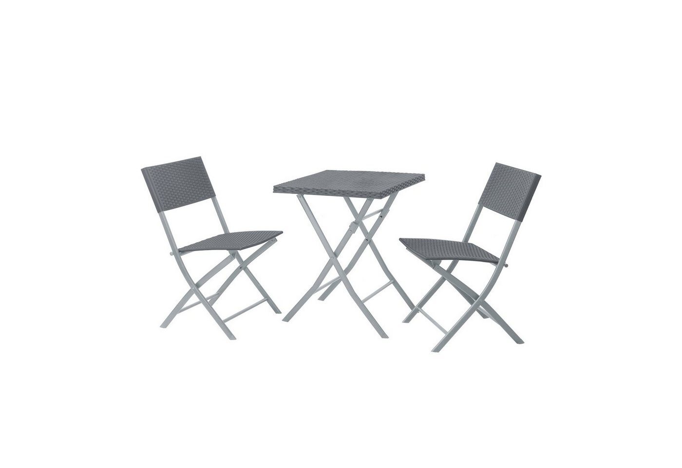 Das SVITA Polyrattan Bistro-Set in Grau ist ideal für Balkon, Terrasse oder Garten. Das klappbare Set besteht aus 2 Stühlen und einem Tisch mit Polyrattan-Elementen. Die UV-beständigen Möbel sind leicht zu reinigen und witterungsbeständig. Der Tisch hat die Maße 58x72,5 cm und die Stühle 55 x 39,5 x 79 cm. **Highlights** - Klappbare Metall-Möbel für platzsparende Aufbewahrung - UV-beständig und witterungsbeständig für den Outdoor-Einsatz - Bodenschonende Kunststoff-Füße für Kratzschutz - Sitzgelegenheit für 2 Personen - Max. Belastbarkeit der Stühle je ca. 100 kg **Produkteigenschaften** - Quadratischer Klapptisch: 58x72,5 cm (LxH) - Klappbare Stühle: 55 x 39,5 x 79 cm (LxBxH) - Sitzfläche der Stühle: 39,5x39,5 cm - Sitzhöhe: 46 cm - Material: Polyrattan / pulverbeschichtete Stahlrohre - Gewicht: ca. 11 kg - Max. Belastbarkeit Tisch: 50 kg **Lieferumfang** - 1x Tisch - 2x Stuhl