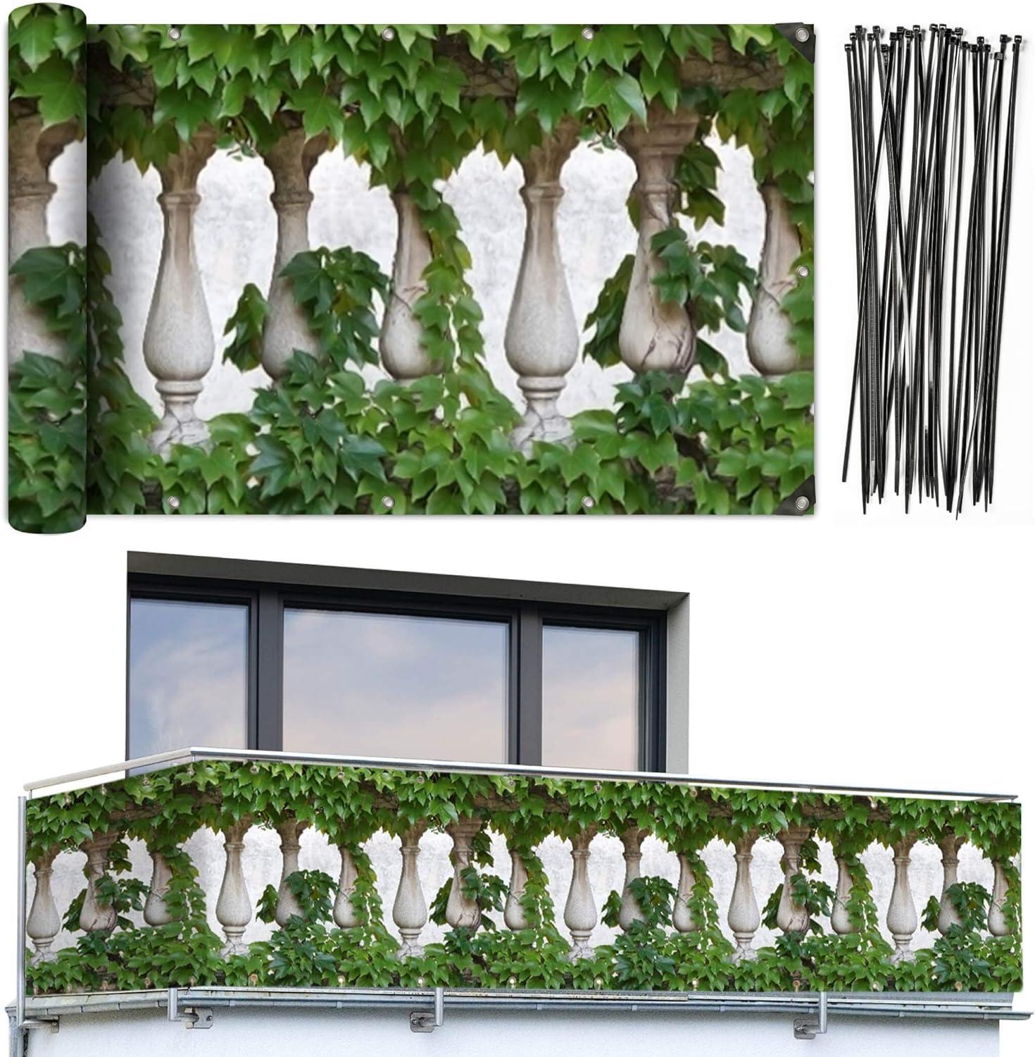 Die Balkonüberdachung Ivy Fence bietet Ihnen einen effektiven Sichtschutz und verbessert das Erscheinungsbild Ihres Balkons. Mit einer Länge von 5 m und einer Breite von 35 cm sorgt sie für mehr Privatsphäre und schützt vor Wind. Die realistische Efeu-Imitation aus strapazierfähigem, UV- und regenbeständigem Kunststoff bleibt auch nach Jahren farbenfroh. Die Montage ist einfach, dank der im Lieferumfang enthaltenen 25 extralangen Kabelbinder. **Highlights** - Sichert den Balkon und garantiert Privatsphäre - Realistische Efeu-Imitation für ein ansprechendes Design - Langlebiges, UV- und regenbeständiges Material - Einfache Befestigung mit 25 extralangen Kabelbindern - Individuell zuschneidbar für verschiedene Balkongrößen **Produkteigenschaften** - Abmessungen: 5 m x 35 cm - Material: strapazierfähiger Kunststoff - UV- und witterungsbeständig - 24 eingearbeitete Metall-Ösen zur Montage **Lieferumfang** - 1 x Balkonüberdachung Ivy Fence - 25 x extralange Kabelbinder - 24 x eingearbeitete Metall-Ösen