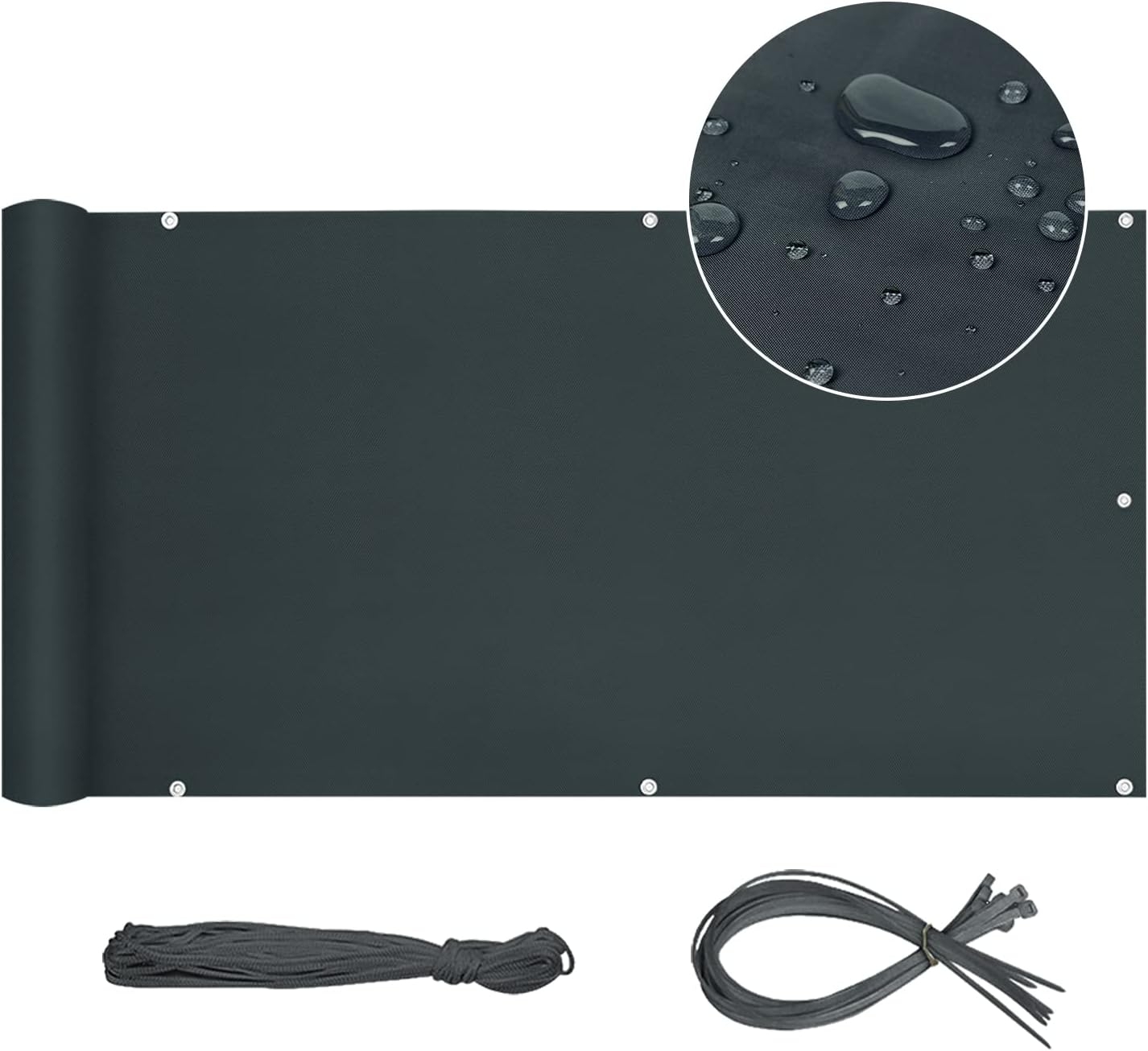 Sekey Balkon Sichtschutz Balkonabdeckung Oxford 90 x 600 cm in Anthrazit bietet Ihnen einen robusten und undurchsichtigen Schutz. Hergestellt aus wasser- und winddichtem Oxford-Gewebe mit UV-beständiger PU-Beschichtung, sorgt dieser Sichtschutz für Privatsphäre und Sicherheit. Die rostfreien Ösen ermöglichen eine einfache Installation ohne Bohren. Ideal für Balkone, Gärten und Terrassenüberdachungen. **Highlights** - Robustes und undurchsichtiges Oxford-Gewebe - Rostfreie Ösen für einfache Installation - Vielseitig einsetzbar als Sicht- und Sonnenschutz - UV-beständig und reißfest - Individuell zuschneidbar **Produkteigenschaften** - Maße: 90 x 600 cm - Farbe: Anthrazit - Wasserdichte PU-Beschichtung - 3 Ösen in der Höhe im Abstand von 50 cm - Maximale Zuglast der Kabelbinder: 22 kg **Lieferumfang** - Balkon Sichtschutz aus Oxford-Gewebe - Nylon Kabelbinder - Kordel