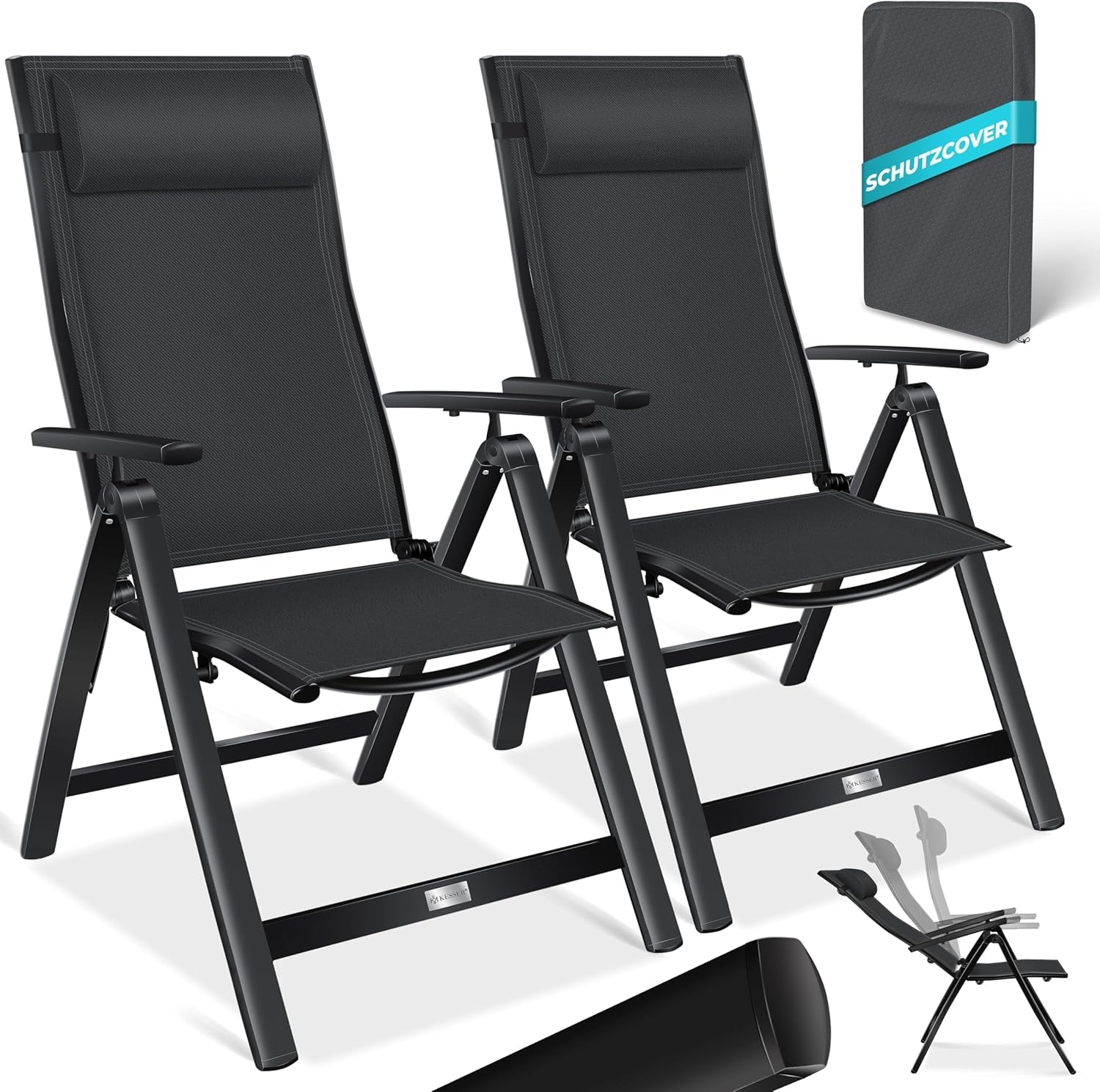Name KESSER® Gartenstuhl Hochlehner mit Armlehnen | Aluminium Klappstuhl inkl. Kopfkissen Campingstuhl 7-Fach Verstellbar Rückenlehne | Atmungsaktiv & Wetterfest | Klappbar & Anti-Rutsch Schwarz, 2 Stück