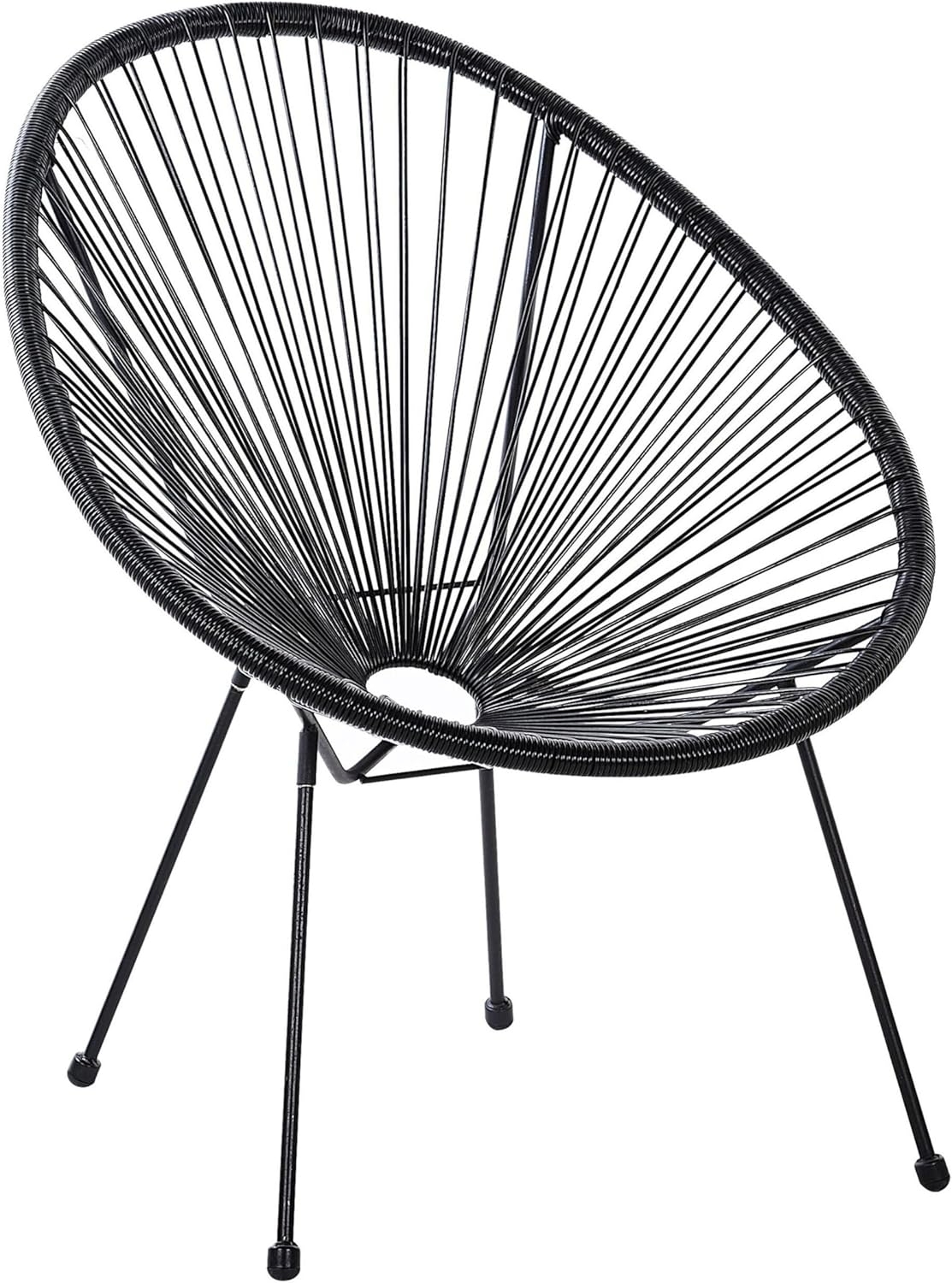 Trendy Spaghetti-Sessel ACAPULCO II in elegantem Schwarz für Innen- und Außenbereiche. Der bequeme Stuhl ist aus robuster, pflegeleichter Schnurbespannung aus PE Rattan gefertigt und kombiniert mit einem stabilen Stahlgestell. Mit einem luftigen Design und einem Gewicht von nur 5 kg ist er der ideale Begleiter für entspannte Sommertage. Genießen Sie Urlaubsstimmung in Ihrem Garten oder auf Ihrem Balkon. **Highlights** - Stabile Konstruktion für maximalen Komfort - Geeignet für den Innen- und Außenbereich - Unkomplizierte Selbstmontage - Schutzkappen zum Schutz des Bodens - Leichtes Gewicht und einfach zu transportieren **Produkteigenschaften** - Typ: Cocktailsessel - Stil: Boho - Farbe: Schwarz - Material: PE Rattan - Gestellmaterial: Metall - Maße (HxBxT): 87 x 70 x 90 cm - Sitzhöhe: 41 cm - Gewicht: 5 kg - Max. Belastung: 160 kg - Beständigkeit: Feuchtigkeitsbeständig, Schmutzbeständig, UV-beständig **Lieferumfang** - 1 x Stuhl - Beine / Füße nicht montiert