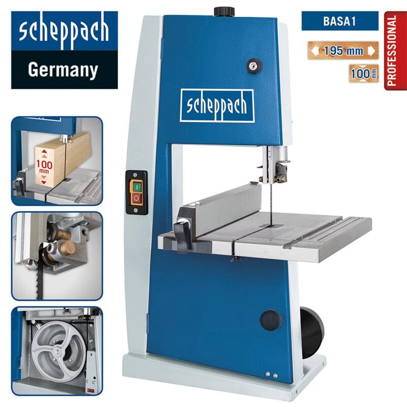 - Die Scheppach Bandsäge BASA1 hat eine Motorleistung von 300 Watt, die eine konstante Schnittgeschwindigkeit von 880 m/min ermöglicht.