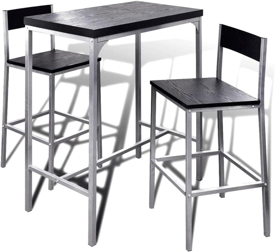 Dieses elegante Frühstücksbar-Set vereint Stil und Funktionalität. Mit klaren Linien und einem kompakten Design ist es ideal für Wohnungen, Cafés, Pubs oder Wintergärten. Die Hocker lassen sich platzsparend unter dem Tisch verstauen. Hergestellt aus hochwertigem MDF in Schwarz und stabilen Stahlrahmen, ist das Set langlebig und leicht zu reinigen. Der Zusammenbau gestaltet sich einfach. **Highlights** - Kompaktes Design für platzsparende Nutzung - Hochwertiges MDF in Schwarz für einfache Reinigung - Stabile Stahlrahmen für Langlebigkeit - Einfache Montage - Max. Tragfähigkeit: 110 kg **Produkteigenschaften** - Tischgröße: 89 x 45 x 100 cm (L x B x H) - Stuhlgröße: 39 x 40 x 95,5 cm (B x T x H) - Sitzbreite: 39 cm - Sitztiefe: 36 cm - Rückenlehnen-Höhe: 30 cm - Armlehnenhöhe vom Boden: 67,5 cm **Lieferumfang** - 1 x Hoher Tisch - 2 x Stühle - Einfache Montage