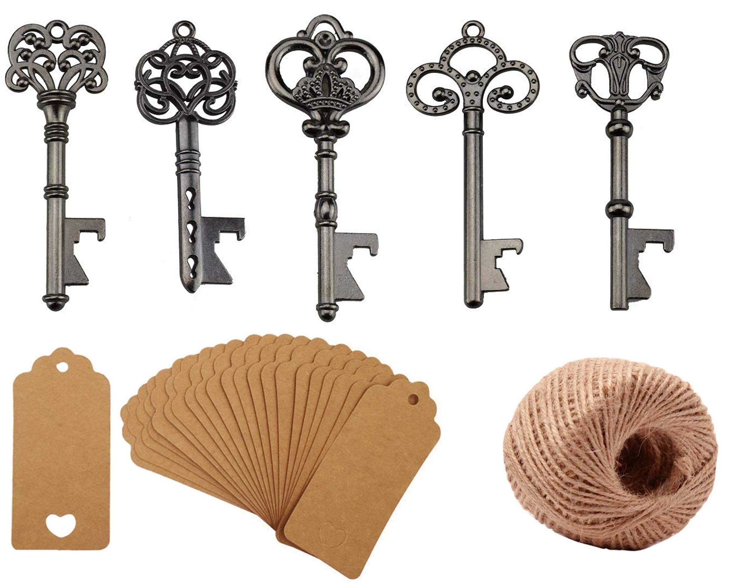 Yansanido 50 Stück Skelett Schlüssel Flaschenöffner Mit Escort-Tag Karte Und Bindfäden Für Hochzeitsgastgeschenke Für Gäste Partyzubehör Mixed 5 Styles Black