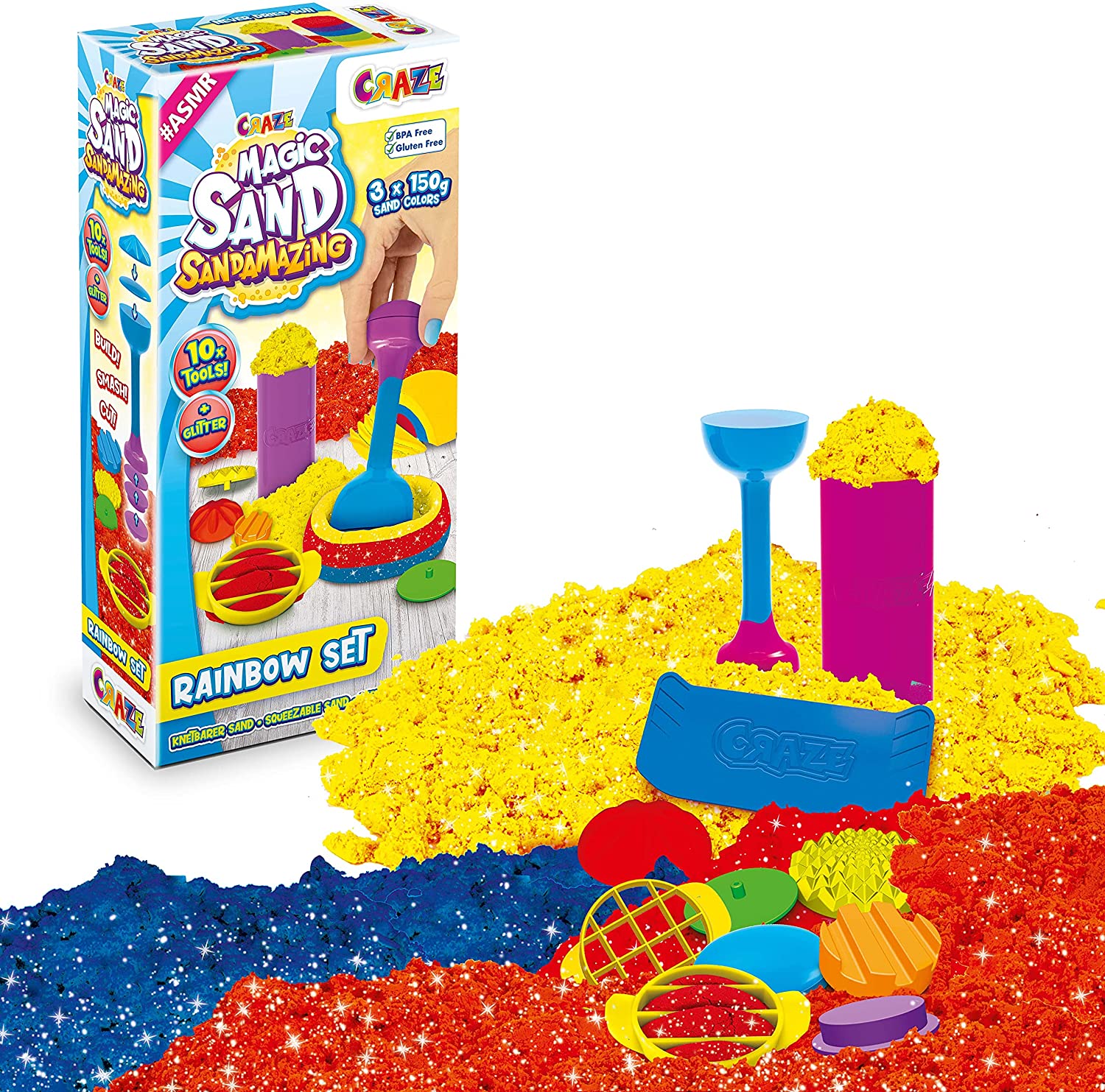 - Sandamazing- Rainbow Set enthält 3x 150g Sand in verschiedenen Farben (Blau, Gelb, Rot)