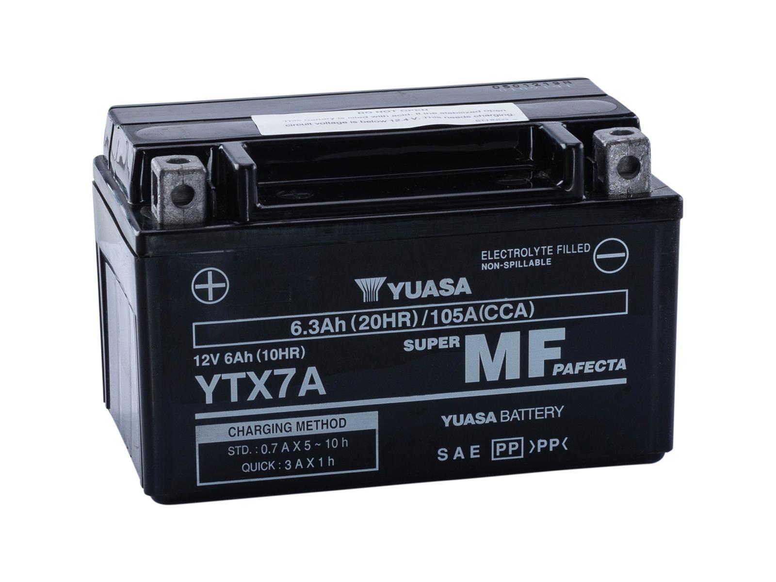 - Die YTX7A-BS Batterie hat eine Kapazität von 6 Ah und liefert einen Kälteprüfstrom von 105 A.
