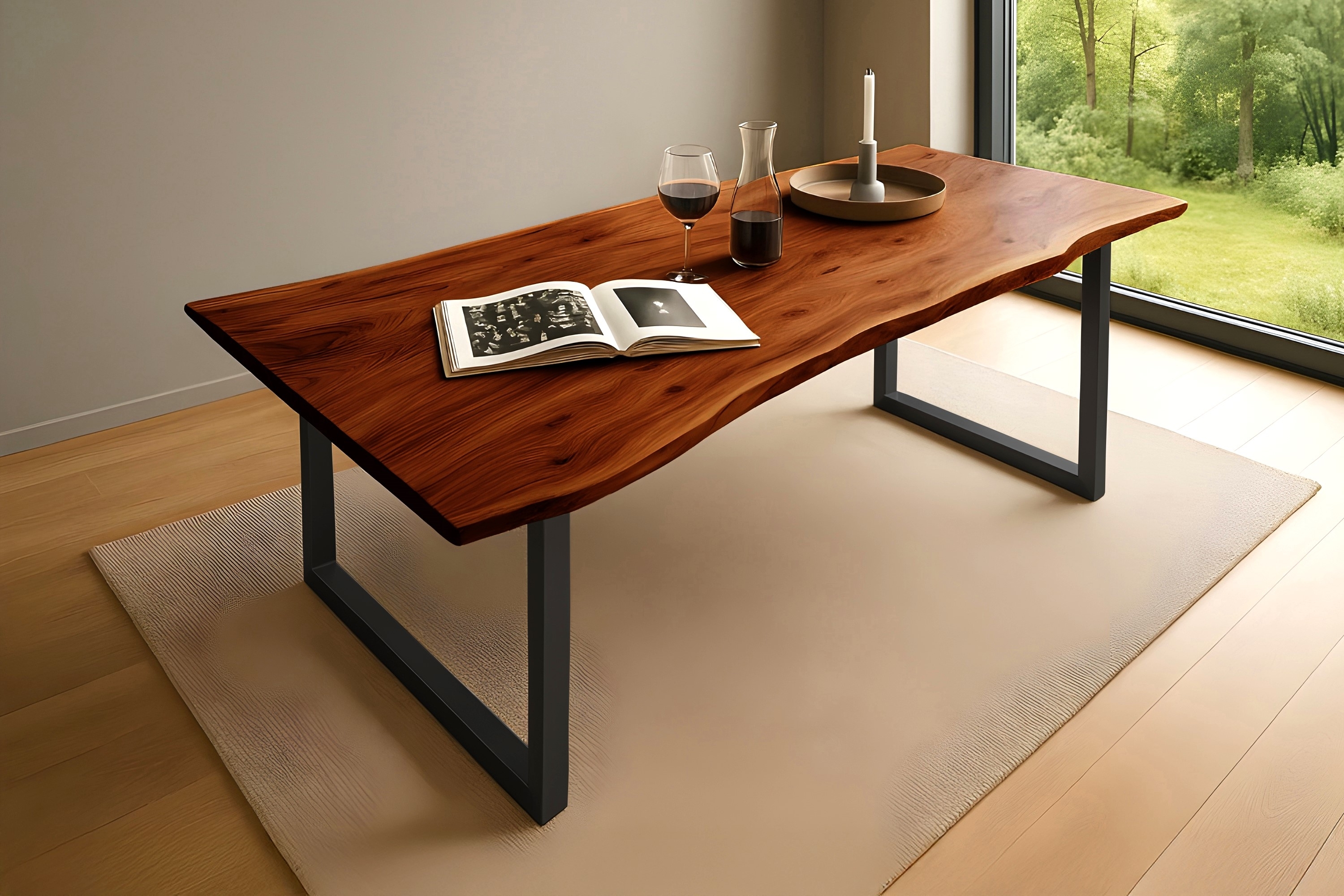 Der Esstisch Quinn aus massiver Akazie mit Baumkante in Nussbaumfarben und einem stabilen, schwarzen U-förmigen Metallgestell ist ein echter Blickfang für jeden Essbereich. Mit einer Größe von 180 x 90 cm bietet er Platz für 6-8 Personen. Die natürliche Holzmaserung und die robuste Verarbeitung machen diesen Tisch zu einem einzigartigen Möbelstück, das in jedem Zuhause für Aufsehen sorgt. **Highlights** - Einzigartige Baumkante aus echtem Akazienholz - Pflegeleichte Tischplatte in Nussbaumfarben - Stabiles Metallgestell in U-Form für einen industriellen Look - Platz für 6-8 Personen - Jedes Möbelstück ist ein Unikat mit individueller Holzmaserung **Produkteigenschaften** - Tischmaße: Länge 180 cm x Breite 90 cm x Höhe 77 cm - Tischplattenstärke: ca. 2,6 cm - Gestellstärke: 8 x 4 cm - Innenabstand der Tischbeine: ca. 118 cm - Massivholzplatte aus einzelnen Lamellen - Natürliche Form der Baumstammkante - Pflegeleichtes und belastbares Akazienholz - Schwarz lackiertes Metallgestell für Standfestigkeit **Lieferumfang** - 1 x Tischplatte - 2 x Metallgestell - Montagematerial
