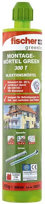 - Der fischer Montagemörtel GREEN 300 T ist ein 2K-Injektionssystem auf Vinylesterbasis.