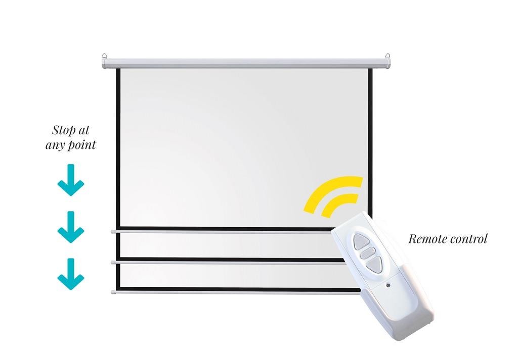 - Die Leinwand kann sowohl an der Wand als auch an der Decke montiert werden und wird mit einer Fernbedienung geliefert, die eine einfache Bedienung ermöglicht.