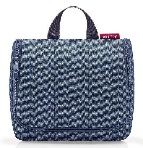 - Die Toiletbag XL in Dunkelblau mit Fischgrätmuster ist ein praktischer Begleiter auf Reisen