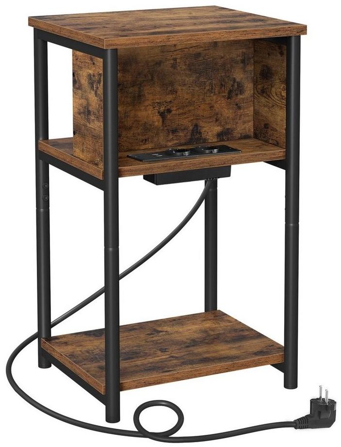 * **[Beistelltisch mit Steckdose]** Dieser Beistelltisch verfügt über eine integrierte Steckdose mit 2 AC-Anschlüssen, 2 USB-Anschlüssen und einem 2 m langen Ladekabel, mit dem Sie Ihre Geräte mit Strom versorgen können, ohne Ihren Sitzplatz zu verlassen * **[Durchdachte Details]** Horizontale Steckdosenleiste für einfaches Aufladen; der Spalt zwischen der Steckdosenleiste und der Tischplatte bieten einen geordneten Durchgang für Ihre Kabel. Kabelmanagement statt Kabelsalat * **[Alles hat seinen Platz]** Eine Lampe auf der Oberfläche, eine Fernbedienung auf der mittleren Ablage und Lieblingsbücher auf der unteren Ablage – mit diesem 3-stufigen Nachttisch haben Sie alle benötigten Gegenstände gut organisiert * **[Robust und stabil]** Mit einem Stahlrahmen, hochwertigen Spanplatten und verstellbaren Füßen kann jede Ablage dieses Nachtschranks bis zu 10 kg tragen * **[Platzsparend]** Mit einer Größe von 30 x 34 x 58 cm passt dieser schlanke Beistelltisch perfekt in den kleinen Raum zwischen zwei Polstersesseln oder neben das Bett | Praktische SteckdoseDie vertikale Dreiloch-Buchse sorgt dafür, dass Ihr Kabel den anderen Ladeanschlüssen nicht im Weg steht. | KabelmanagementMithilfe des Kabellochs auf der Tischplatte können Sie die Kabel übersichtlich anordnen. | Passt in kleine EckeDieser schlanke Beistelltisch mit einer Größe von 30 x 34 x 58 cm passt perfekt in kleine Ecken. | **Produktdetails:** - Farbe: Vintagebraun-Schwarz - Material: Holzspanplatte, Stahl - Größe: 30 x 34 x 58 cm (T x B x H) - Gewicht: 5,7 kg - Max. statische Belastbarkeit pro Ablage: 10 kg - Max. statische Belastbarkeit insgesamt: 30 kg **Lieferumfang:** - 1 x Beistelltisch - 1 x Zubehörpaket - 1 x Anleitung