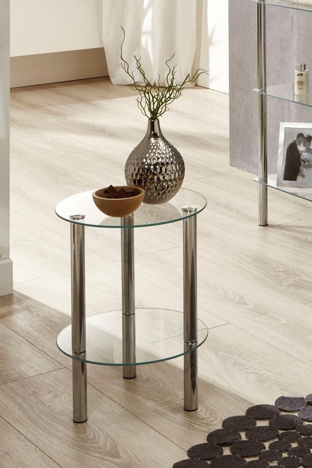 **Ausführung** **Gestell:** Stahlrohr verchromt Tischplatte und Ablage: Sicherheitsklarglas **Ausstattung** mit 1 Ablage unterhalb der Tischplatte Lieferumfang 1 Beistelltisch Farbe Chrom-Glas Typ Beistell- & Ecktisch Material Glas, Metall Form rund **Ausstattung** Ablage Stil Modern **Maße** B/H/T ca. 35/47/35 cm