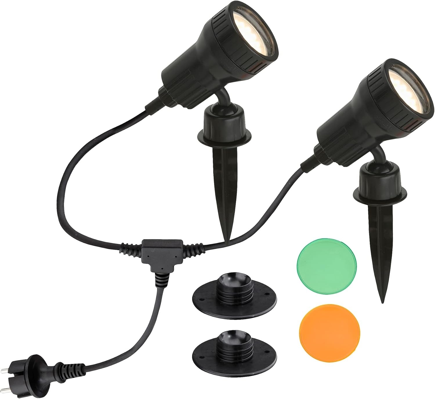 Die BRILONER Außenleuchte ist ein praktisches 2er-Set, das sich ideal für Ihren Garten oder als Wegeleuchte eignet. Mit einer Schutzart von IP44 und einer Steckerzuleitung von 2,0 m sind die Leuchten sowohl schwenk- als auch drehbar. Inklusive sind zwei LED GU10 Leuchtmittel mit 3 W und 250 Lumen, die eine warmweiße Lichtfarbe von 3.000 K bieten und eine durchschnittliche Lebensdauer von 25.000 Stunden haben. **Highlights** - 2er-Set für vielseitige Anwendung im Garten - IP44 Schutzart für den Außenbereich - Schwenk- und drehbare Spots für individuelle Lichtgestaltung - Inklusive 2 x LED GU10 3W 250lm 3.000K (warm weiß) Leuchtmitteln - Durchschnittliche Lebensdauer von 25.000 Stunden **Produkteigenschaften** - Maße: 100x195 mm (B x H) - Steckerzuleitung: 2,0 m - Energieeffizienzklasse: F - Farbfilter: je ein orangener und grüner Farbfilter pro Spot - Wandhalterung und Erdspieß im Lieferumfang enthalten **Lieferumfang** - 2 x Außenleuchten - 2 x Erdspieß - 2 x Wandhalterung - 2 x Farbfilter (orange und grün) - 2 x LED GU10 3W 250lm 3.000K (warm weiß) Leuchtmittel