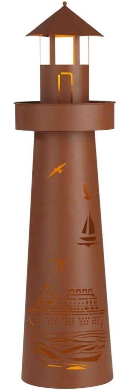 Die Hoberg Dekosäule im Leuchtturm Design bringt maritimes Flair in Ihren Garten oder Balkon. Mit einer Höhe von ca. 80 cm und einer ansprechenden Rost-Optik aus pulverbeschichtetem Stahl ist sie sowohl tagsüber als auch nachts ein echter Blickfang. Das integrierte, warmweiße LED-Licht und die praktische Timerfunktion (6 Stunden) sorgen für stimmungsvolle Beleuchtung. Die bepflanzbare Plattform ermöglicht individuelle Gestaltungsmöglichkeiten. **Highlights** - Höhe: ca. 80 cm - Rost-Optik aus pulverbeschichtetem Stahl - Integriertes warmweißes LED-Licht - Timerfunktion für automatisches Abschalten nach 6 Stunden - Wasserfestes Batteriefach (IP44) für Innen- und Außenbereich **Produkteigenschaften** - Plattform: ca. 5 cm breit, individuell bepflanzbar - Ideal für Wohnbereich, Garten, Terrasse oder Balkon - Komfortabler Batteriebetrieb
