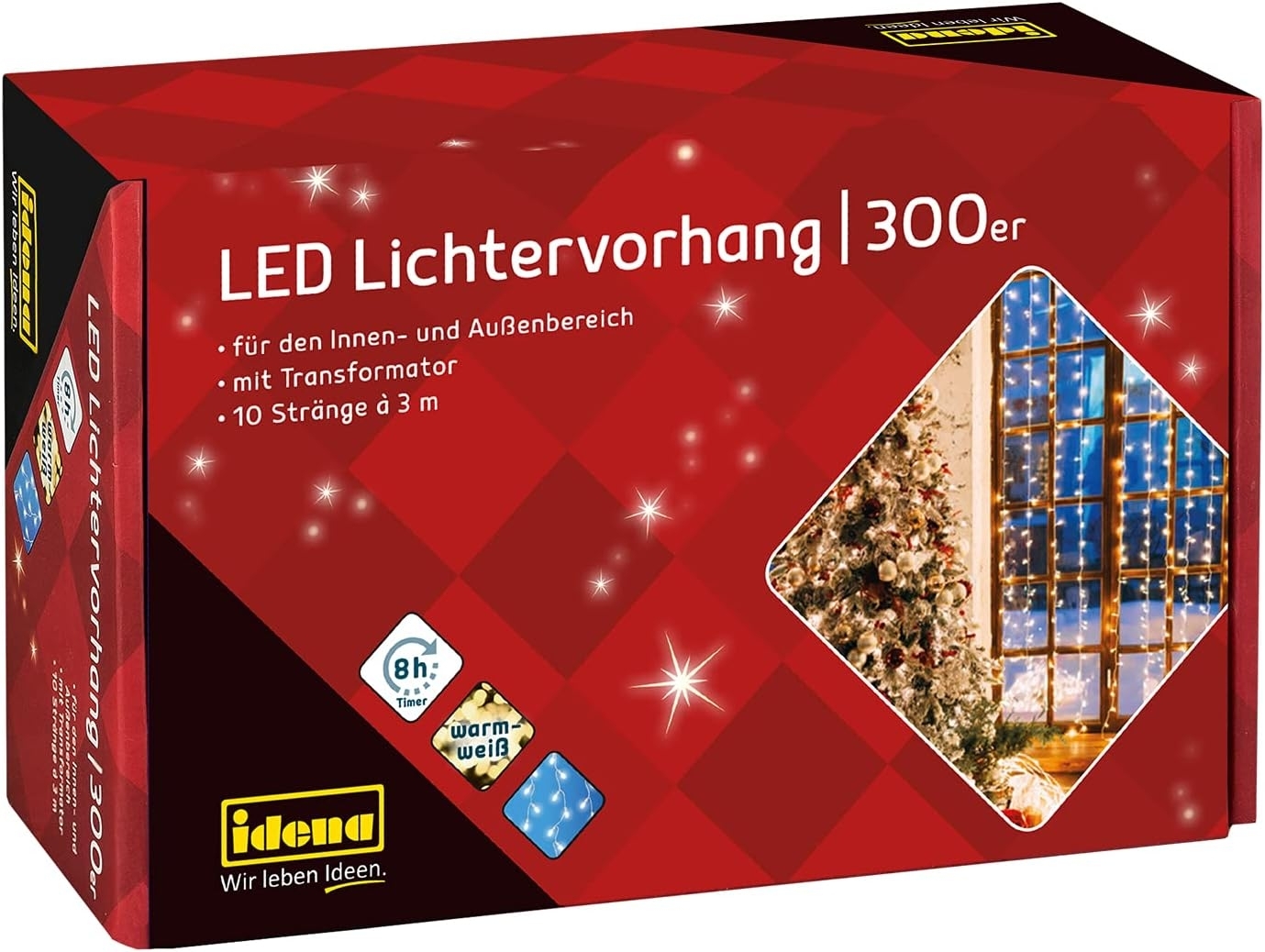 | Name | Idena LED-Lichtervorhang 300er, warmweiß, 3 x 3 m, 10 Stränge, für innen und außen, mit 8h-Timer |
