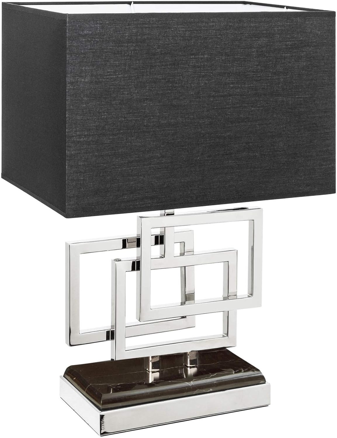 Eine stilvolle Tischleuchte mit modernem Design, die durch ihren extravaganten Fuß aus ineinander verschlungenen, silbernen Rechtecken besticht. Der massive Fuß aus schwarzem und silbernem Metall sorgt für Stabilität, während der schwarze Stoffschirm (100 % Polyester) das elegante Gesamtbild abrundet. Mit einer Höhe von 56 cm fügt sich die ATLANTIS Tischlampe harmonisch in verschiedene Wohnräume ein und setzt eindrucksvolle Akzente. **Highlights** - Extravagantes Design mit ineinander verschlungenen, silbernen Rechtecken - Stabiler Fuß aus schwarzem und silbernem Metall - Schwarzer, eckiger Stoffschirm aus 100 % Polyester - Modernes und zeitloses Design für verschiedene Einrichtungsstile - Stimmungsvolle Beleuchtung ohne Blendung **Produkteigenschaften** - Farbe Schirm: schwarz - Farbe Fuß: silber, schwarz - Material Schirm: Stoff (100 % Polyester) - Material Fuß: Metall, Marmor - Höhe: 56 cm **Lieferumfang** - Tischleuchte ATLANTIS - Ohne Leuchtmittel