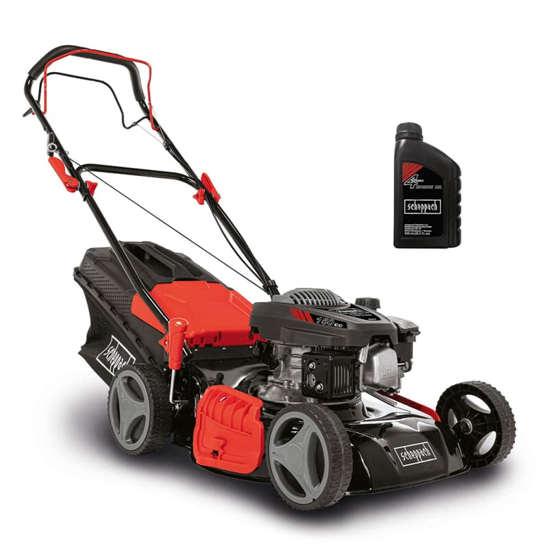 Scheppach MS161-46 Benzin Rasenmäher - 46 cm Schnittbreite | 55 Liter Fangkorb | Stahlgehäuse | 7-stufige Höhenverstellung | Mulchfunktion | Radantrieb | Seitenauswurf | inkl. Motoröl