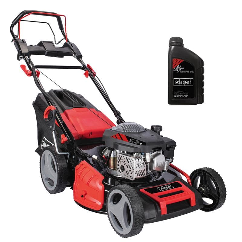 Scheppach MS173-51E Benzin-Rasenmäher - 51 cm SchnittbreiteE-Start, Reinigungsfunktion, 65l Fangkorb, 7-stufige Höhenverstellung, Mulchfunktion, Radantrieb, Seitenauswurf, inkl. Motoröl