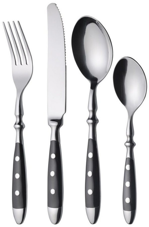 Das GRÄWE Tafelbesteck "NÜRNBERG" ist ein robustes und pflegeleichtes Besteckset aus hochwertigem Edelstahl. Mit seinem besonderen Bistro-Charme eignet es sich perfekt für den täglichen Einsatz vom Frühstück bis zum Abendessen. Die schwere, geschmiedete Qualität sorgt für ein angenehmes Gewicht und liegt komfortabel in der Hand. Die schwarzen Griffschalen verleihen dem Besteckset einen eleganten Look. **Highlights** - Robustes und pflegeleichtes Tafelbesteck aus hochwertigem Edelstahl - Schwere, geschmiedete Qualität für ein angenehmes Gewicht - Schwarze Griffschalen für einen eleganten Look - Feiner Wellenschliff der Tafelmesser für optimale Schärfe - Erweiterbar mit weiteren Besteckteilen aus der Serie NÜRNBERG **Produkteigenschaften** - Material: Edelstahl 18/0 - Spülmaschinengeeignet - Durchgehende Edelstahlnieten **Lieferumfang** - 6 Menümesser mit Wellenschliff, Länge ca. 22 cm, Gewicht ca. 65 g - 6 Menügabeln, Länge ca. 20 cm, Gewicht ca. 67 g - 6 Menülöffel, Länge ca. 19,5 cm, Gewicht ca. 76 g - 6 Kaffeelöffel, Länge ca. 15 cm, Gewicht ca. 50 g