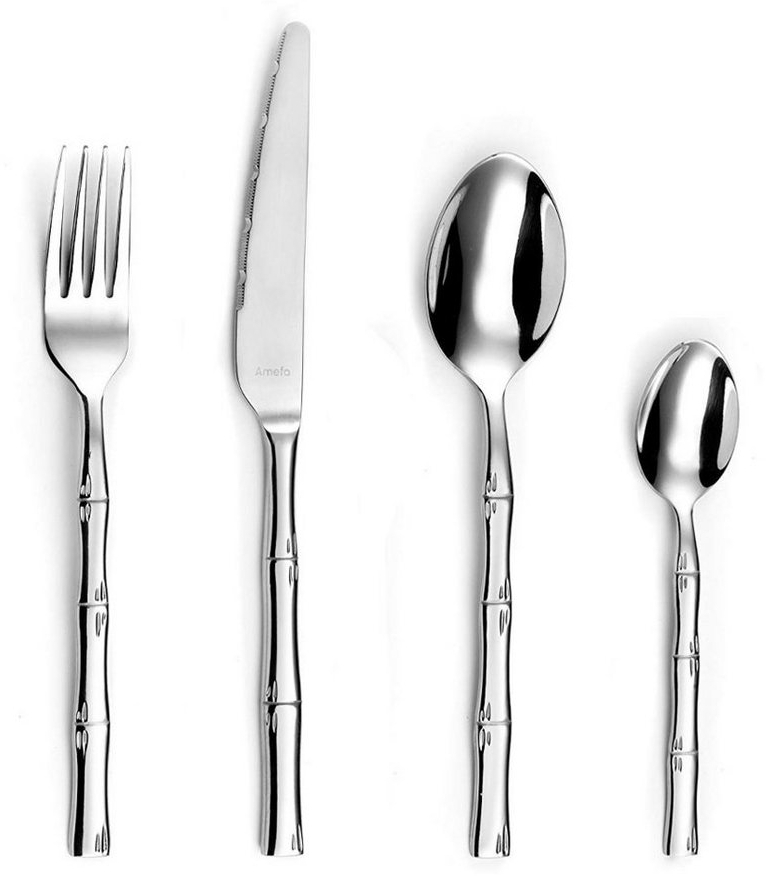 Das Amefa KARMA Besteckset ist ein 24-teiliges Set, das durch sein ansprechendes Bambus-Dekor und die hochglanzpolierte Ausführung besticht. Es eignet sich ideal für 6 Personen und bietet eine besondere Haptik durch das runde Griffdesign. Die Besteckteile liegen gut in der Hand und überzeugen durch die Verwendung von gehärtetem Klingenstahl und Spezial-Wellenschliff, der ein müheloses Schneiden ermöglicht. **Highlights** - 24-teiliges Set für 6 Personen - Hochglanzpolierte Ausführung - Griffdesign erinnert an Bambus - Spülmaschinenfest - Gehärteter Klingenstahl mit Spezial-Wellenschliff **Produkteigenschaften** - Material: Klingenstahl 13/0, Edelstahl 18/0 - Besteckteile: 6 Menümesser, 6 Menügabeln, 6 Menülöffel, 6 Kaffeelöffel - Design: Rundes Griffdesign mit natürlichem Charme **Lieferumfang** - 6 Menümesser - 6 Menügabeln - 6 Menülöffel - 6 Kaffeelöffel