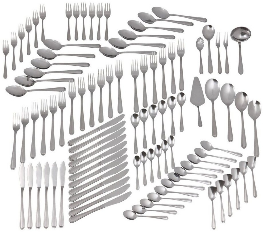 | Set-Bestandteile | 12 Tafelmesser, 12 Tafelgabeln, 12 Tafellöffel, 12 Kaffeelöffel, 12 Kuchengabeln, 6 Fischmesser, 6 Fischgabeln, 6 Espressolöffel, 6 Eierlöffel, 6 Eislöffel, 2 Servierlöffel, 2 Aufschnittgabeln, 1 Salatlöffel, 1 Salatgabel, 1 Tortenheber, 1 Sahnelöffel, 1 Zuckerlöffel, 1 Saucenlöffel |