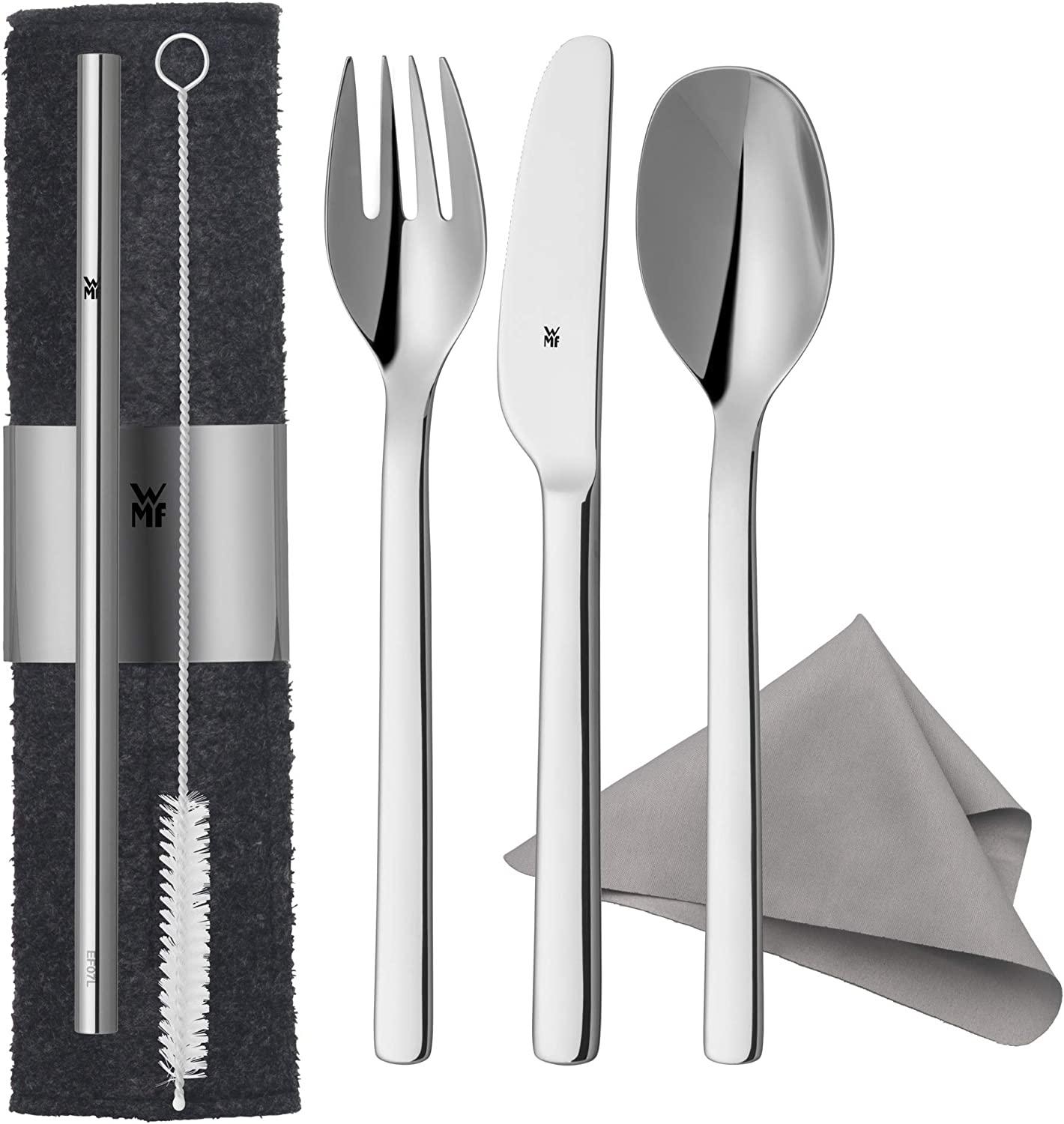 - Inhalt: 1x Gabel 18,5 cm, 1x Löffel 18,5 cm, 1x Messer 19,0 cm, 1x Edelstahl-Trinkhalm 19 cm, 1x Reinigungsbürste, 1x Bestecketui, 1x Reinigungstuch, 1x Clipverschluss - Artikelnummer: 1295036040 - Material: Cromargan Edelstahl poliert (glänzend) - rostfrei, spülmaschinenfest, unverwüstlich und kratzbeständig. Waschbares Reinigungstuch und Etui in Filzoptik (100 % recyceltem Kunststoff) - Hergestellt aus langlebigen Materialien ist das nachhaltige Set der umweltfreundliche Ersatz für Einwegbesteck - ein toller Begleiter für Büro, Schule, Mittagessen, Camping, Wandern uvm. - Das Besteckset enthält eine Gabel in „göffelähnlicher“ Form, ein abgerundetes Messer zum einfachen Schneiden/ Streichen und ein Löffel mit tiefer Laffe, um den Tassen-/ Becherboden besser zu erreichen - Als stilvolle Aufbewahrung ermöglicht das Bestecketui mit Clip den problemlosen Transport. Jedes Besteckteil verfügt über eine eigene Einstecktasche, die es an seinem Platz hält Material: - Cromargan Edelstahl poliert, Etui aus 100% recyceltem Kunststoff - Inhalt: 1x Gabel, 1x , Löffel, 1x Messer, 1x Edelstahl-Trinkhalm, 1x Reinigungsbürste, 1x Bestecketui, 1x Reinigungstuch, 1x Clipverschluss - Besteck und Trinkhalm sind spülmaschinenfest und rostfrei. Das Reinigungstuch und Bestecketui sind waschmaschinengeeignet - Besteck und Clipring können mit einer individuellen Gravur versehen werden