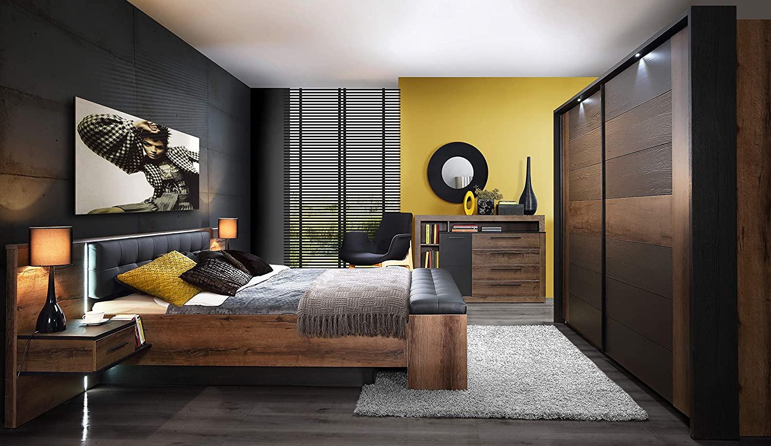 FORTE Bellevue Bettanlage mit inkludierten 2 Nachtkommoden Holzwerkstoff, Schwarz Eiche/Schlammeiche, 208,7 x 304,6 x 96,5 cm