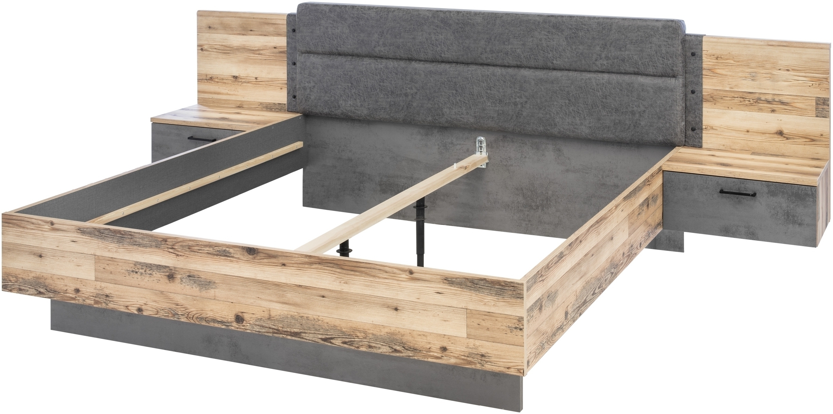 Die Bettanlage ALICANTE kombiniert modernes Design mit funktionalem Komfort. Mit einer Gesamtbreite von 305,6 cm, einer Höhe von 99,5 cm und einer Tiefe von 213,4 cm bietet sie ausreichend Platz für erholsamen Schlaf. Die Liegefläche misst 180x200 cm. Die stilvolle Kombination aus Alpine Lodge und Betonoxid verleiht Ihrem Schlafzimmer einen zeitgemäßen Charakter. Das gepolsterte Kopfteil aus grauem Kunstleder sorgt für zusätzlichen Komfort und eine ansprechende Optik. **Highlights** - Gepolstertes Kopfteil mit grauem Kunstlederbezug für angenehme Rückenstütze - Langlebige und pflegeleichte Dekorfolie für den täglichen Gebrauch - Hochwertiger Holzwerkstoff für Stabilität und Langlebigkeit - Zwei Nachtkommoden mit geräumigen Schubkästen - Lieferung zerlegt für einfachen Transport und unkomplizierten Aufbau **Produkteigenschaften** - Maße (BxHxT): 305,6 x 99,5 x 213,4 cm - Liegefläche: 180x200 cm - Innenmaße der Schubladen: 59,8 cm (B) x 26 cm (H) x 40 cm (T) - Farbe: Alpine Lodge / Betonoxid **Lieferumfang** - Bettanlage ALICANTE - 2 Nachtkommoden - Lattenrost und Matratze sind nicht enthalten