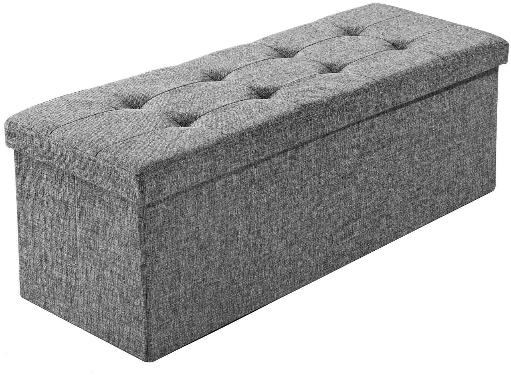 Die faltbare Sitztruhe von tectake vereint Funktionalität und modernes Design. Mit großzügigem Stauraum für Kleidung, Schuhe und Bettwäsche bietet sie nicht nur Platz, sondern auch eine bequeme Sitzmöglichkeit. Der stabile Rahmen aus MDF-Platten und das Polster aus hochdichtem Schaumstoff garantieren Langlebigkeit. Bei Nichtgebrauch lässt sich die Truhe einfach zusammenfalten und benötigt wenig Platz. **Highlights** - Faltbar für platzsparende Aufbewahrung - Bequeme Sitzmöglichkeit und Fußablage - Hochwertige Materialien für Stabilität und Langlebigkeit - Viel Stauraum für verschiedene Gegenstände - Modernes, zeitloses Design **Produkteigenschaften** - Totalmaße (LxBxH): 110 x 38 x 38 cm - Innenmaße (LxBxH): 107 x 34 x 34 cm - Maße geklappt (LxBxH): 110 x 38 x 8 cm - Gewicht: 8,3 kg - Material: MDF Faserplatten, Polyester, hochdichter Schaumstoff, Antifeuchtigkeitsisolierschicht **Lieferumfang** - 1 faltbare Sitztruhe