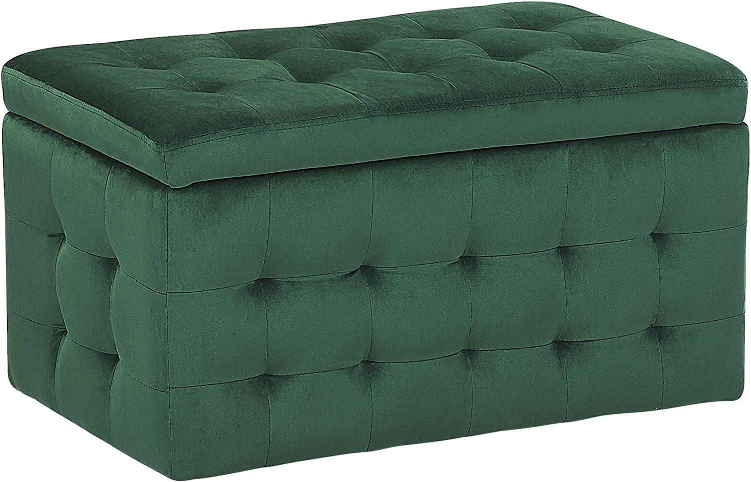 Elegante Betttruhe in edlem Dunkelgrün mit viel Stauraum. Vielseitig nutzbar als Sitz- oder Fußbank, Bettbank oder im Eingangsbereich. Stabile Holzkonstruktion mit Samtbezug für schicken Komfort. Ottomane im Retro-Stil, rechteckig mit Polsterung, Schaumstofffüllung und praktischem Stauraum. **Highlights** - Polsterung mit dekorativer Steppung: Verleiht der Ottomane ein elegantes Aussehen. - Seidenweicher, geschmeidiger Stoff: Samtstoff sorgt für hohen Sitzkomfort. - Vielseitige Nutzungsmöglichkeiten: Als Sitzgelegenheit und zur Aufbewahrung geeignet. - Praktischer, großer Stauraum: Bietet Platz für Handtaschen, Wollmützen und mehr. - Schutzkappen zum Schutz des Bodens: Verhindern Kratzer und Beschädigungen. **Produkteigenschaften** - Typ: Ottomane - Stil: Retro - Farbe: Grün - Farbton: Dunkelgrün - Material: Samtstoff - Zusätzliches Material: Kunststoff - Füllmaterial: Schaumstoff - Zusammenstellung: 100% Polyester - Form: Rechteckig - Muster: Kein Muster - Schaumstoffdichte: 24 kg/m3 - Stauraum: Ja - Tiefe: 42 cm - Breite: 72 cm - Höhe: 40 cm - Sitzfläche: 72x42 cm - Gewicht: 9 kg - Max. Belastung: 80 kg **Lieferumfang** - 1 x Ottomane **Pflegeanleitung** **Samtstoff:** 1. Oberflächen vorsichtig absaugen 2. Flecken mit Polsterreiniger oder milden Reinigungsmitteln entfernen.