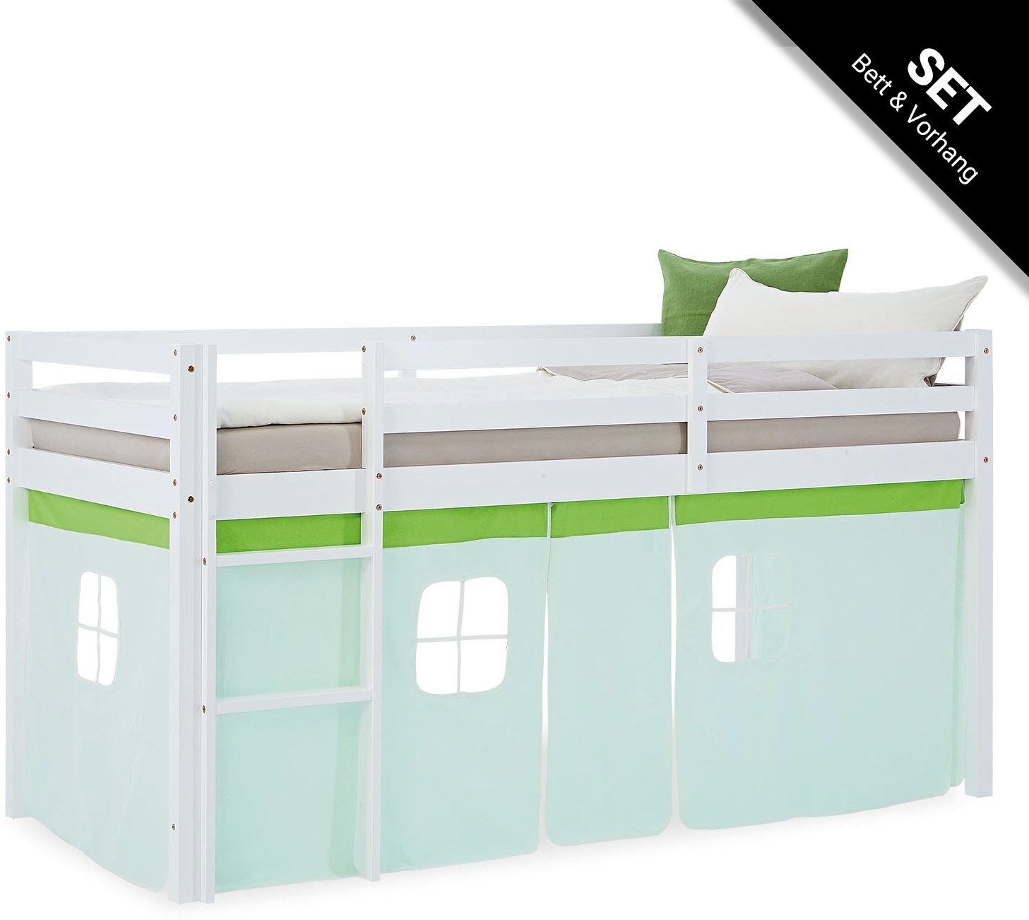 Hochbett Kinder 90x200 cm Kinderbett Kinderhochbett Stockbett Vorhang Grün Leiter Holz Massiv