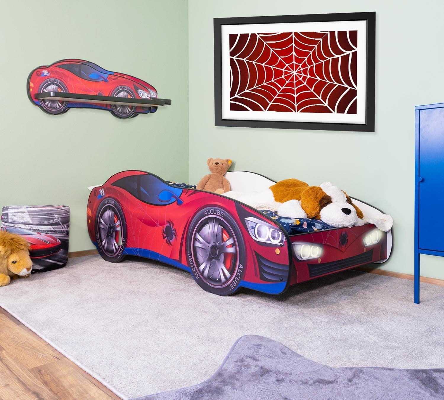 Unser Autobett PKW SPIDER CAR mit Wandregal und LED ist der ideale Schlafplatz für autobegeisterte Kinder. Mit einem aufregenden Spiderman Design und installierten LED-Lichtern wird das Zubettgehen zum Abenteuer. Das Bett ist bis zu 100 kg belastbar und bietet durch abgerundete Kanten sowie hohe Seiten optimale Sicherheit. Im Set sind ein elastischer Lattenrost und eine oekotex zertifizierte Schaumstoffmatratze enthalten. **Highlights** - LED-Beleuchtung für ein aufregendes Ambiente - Wandregal im Superhelden Design für zusätzlichen Stauraum - Schneller Aufbau in nur 20 Minuten - Hohe Belastbarkeit bis zu 100 kg für Spielabenteuer - Abgerundete Kanten und hohe Seiten für maximale Sicherheit **Produkteigenschaften** - Gesamtmaß: 171 x 84 x 56 cm - Liegefläche: 160 x 80 cm - Höhe Einstieg: 30 cm - Material Außenteile Bett: MDF-Platte - Material Matratze: Kaltschaum - Matratzenbezug abnehmbar und bei 60° waschbar - Farbe: rot, blau **Lieferumfang** - 1x Bettgestell - 1x Lattenrost - 1x Matratze - 1x LED-Lichter - 1x Wandregal