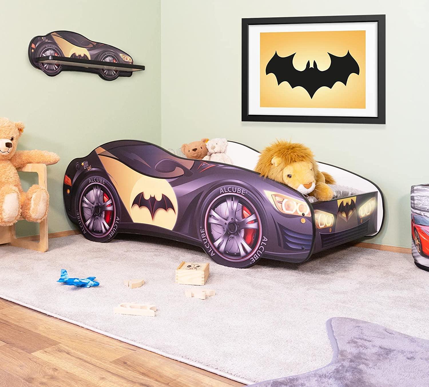 Das Autobett PKW BAT CAR mit Wandregal und LED 140 x 70 cm ist das perfekte Bett für kleine Rennfahrer. Ausgestattet mit LED-Scheinwerfern und einem Superhelden-Wandregal, bietet es nicht nur ein aufregendes Design, sondern auch einen einfachen Aufbau in nur 20 Minuten. Das Bett ist bis 100 kg belastbar und sorgt mit abgerundeten Kanten und hohen Seiten für Sicherheit. **Highlights** - Neues Design mit LED-Scheinwerfern - Inklusive passendem Wandregal in Superhelden Design - Einfacher Aufbau in 20 Minuten - Belastbar bis 100 kg - Sicher mit abgerundeten Kanten und hohen Seiten **Produkteigenschaften** - Farbe: schwarz, gelb, rot - Liegefläche: 70 x 140 cm - Material Bett: MDF-Platte - Material Matratze: Kaltschaum - Gesamtmaß: 151 x 74 x 54 cm - Höhe Einstieg: 30 cm - Matratze abnehmbar und bei 60° waschbar **Lieferumfang** - 1 x Bettgestell - 1 x Lattenrost - 1 x Matratze - 1 x LED-Lichter - 1 x Wandregal