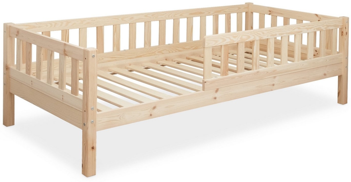 ## Ein gemütlicher Schlafplatz für jedes Kind Unser Kinderbett aus **Kiefer-Massivholz** ist zeitlos, hochwertig und auch für ältere Kinder geeignet. Der **abnehmbare Rausfallschutz** sorgt von Anfang an für Sicherheit. ### Vielseitig &, gemütlich Das Kinderbett aus nachhaltigem Kiefernholz ist ein wunderbarer Platz zum **Schlafen, Lesen, Spielen oder Ausruhen**. Dank der niedrigen Liegehöhe kann dein Kind selbstständig ein- und aussteigen. Nach dem **Montessori-Prinzip** fördert es die Eigenständigkeit deines Kindes. Mit einer Liegefläche von **90×200 cm** bietet es genug Platz zum Kuscheln oder für eine Gute-Nacht-Geschichte. ### Langlebig &, flexibel Der **Rausfallschutz** bietet besonders kleinen Kindern Geborgenheit. Er kann wahlweise rechts oder links angebracht und bei Bedarf entfernt werden – so wächst das Bett mit deinem Kind mit und kann bis ins Jugendalter genutzt werden. Ein passender **Rollrost aus Espenholz** ist bereits im Lieferumfang enthalten. Unser Kinderbett ist in zwei Varianten erhältlich: **naturbelassen** oder **weiß lackiert**. ### Praktisch &, erweiterbar Optional bieten wir einen **Bettkasten mit Rollrost** an – ideal als Stauraum für Bettzeug oder als zusätzliche Liegefläche mit einer zweiten Matratze. Die Kufen sorgen für einen sicheren, festen Stand. Der Bettkasten ist mit Matratze bis **12 cm Höhe** schließbar. Alternativ kannst du das Kinderbett mit einer **Doppelschublade** ergänzen, um noch mehr Stauraum zu gewinnen. ### Nachhaltig &, fair produziert Das Kinderbett wird unter fairen Bedingungen in Europa hergestellt. Wir verwenden ausschließlich **Kiefernholz aus nachhaltiger Forstwirtschaft**. Das Holz ist sorgfältig verarbeitet und frei von rauen Stellen oder scharfen Kanten. **Hinweis:** Matratzen sind nicht im Lieferumfang enthalten.