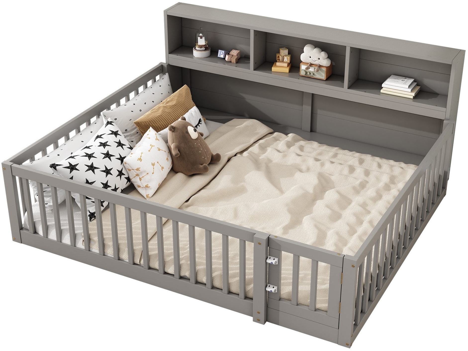| Name | Kinderbett mit Lattenrost und Zaun, 140x200 cm, Rausfallschutz, Stauraum, Regal, Kiefer, grau |