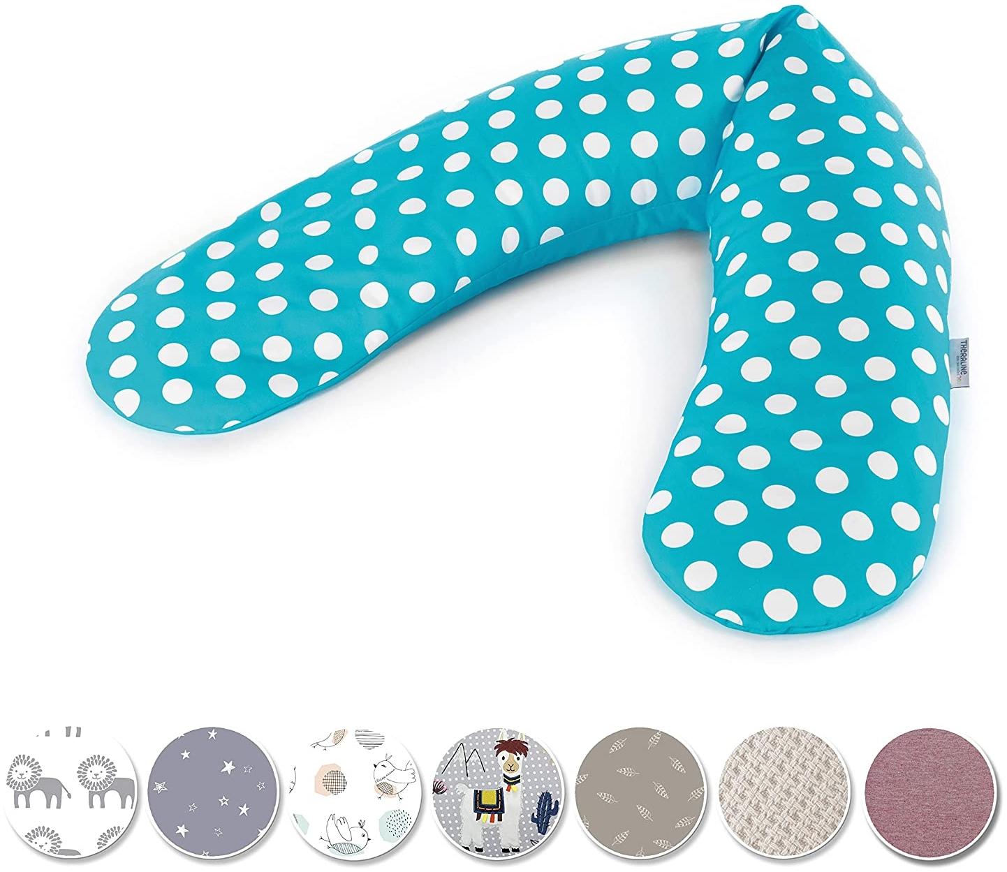 Theraline Das Original Stillkissen inkl. Bezug Dessin 103 Indie Dots petrol Theraline Das Original Stillkissen - Ein besonderes Kissen für eine ganz besondere Zeit - mit zeitlosem Punkte-Bezug Das Original Stillkissen von Theraline ist eine ideale Hilfe, ob als Lagerungskissen in der Schwangerschaft, als Stillkissen oder Sitzhilfe für die ersten Monate Deines Babys. Überzeugende Qualität, für besseren Schlaf in der Schwangerschaft, eine entspanntere Stillzeit und danach als bequemes Baby-, Lese-, Schmuse und Schlafkissen. Es passt sich geschmeidig an die Körperform an, ist weich, geräuscharm und hat hervorragende Wärmeeigenschaften. Langlebige geräuscharme Mikroperlenfüllung (feinste EPS-Perlen), hochwertige, mercerisierte, reine Baumwolle für das Inlett sowie eine aufwendige Nachfüllöffnung für die individuelle Füllmenge ermöglichen eine lange Nutzungsdauer. Theraline-Stillkissen-Original-Anwendungsmoeglichkeiten **Maße**: ca. 190x38 cm Füllmenge: ca. 42 Liter **Material**: **Bezug:** 100% Baumwolle Hülle: 100% Baumwolle Füllung: 100% EPS-Mikroperlen Pflegehinweise: - waschbar bis 60 °C - Trocknung mit reduzierter thermischer Behandlung