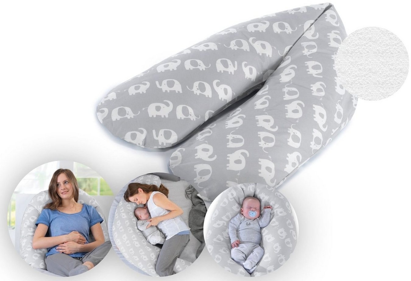 - Das THERALINE 'Elefantenherde' Stillkissen hat eine Länge von ca. 180 cm und eine Füllung aus Mikroperlen, die für eine angenehme Unterstützung sorgt.