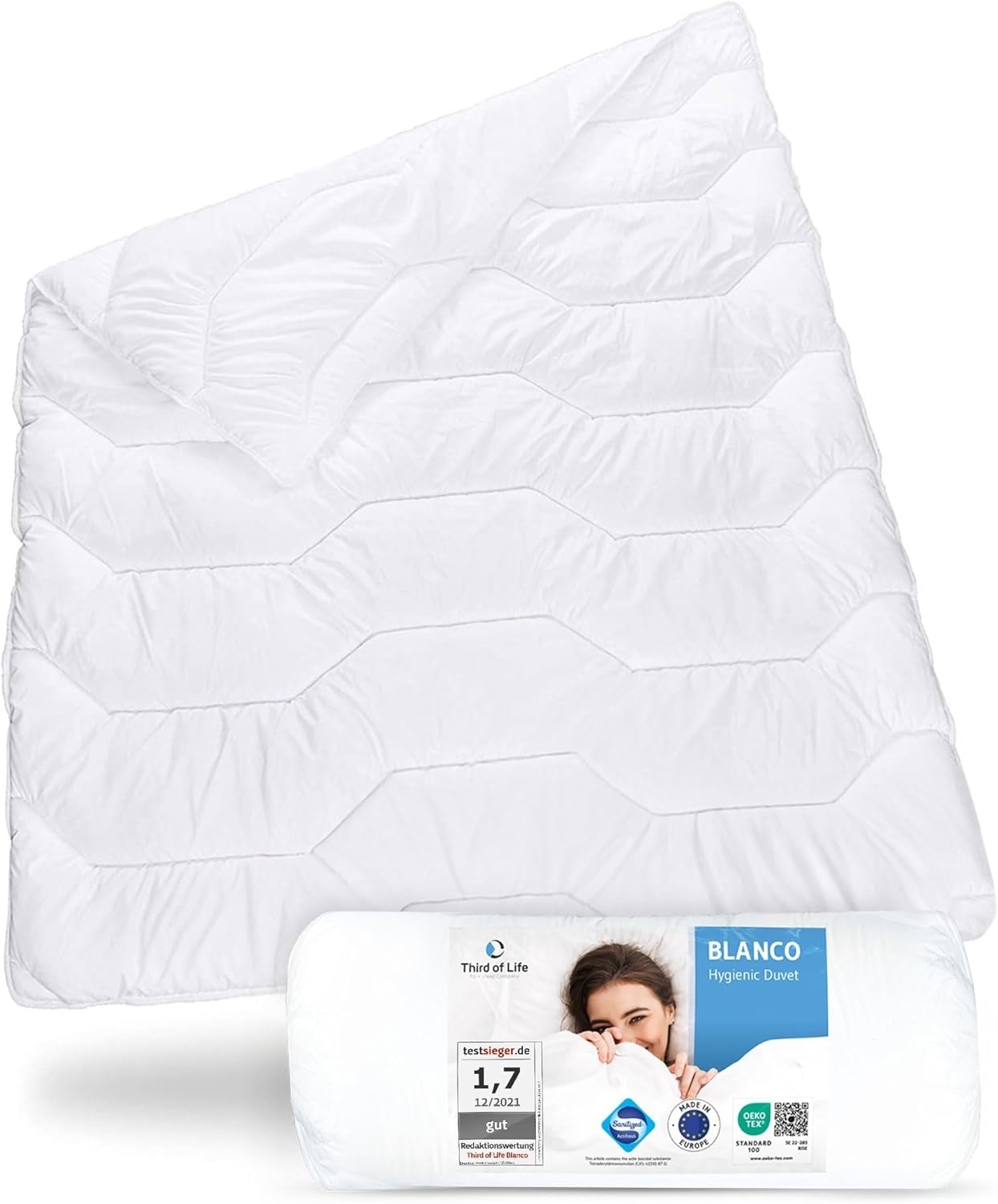 | Beschreibung | Die Bettdecke BLANCO 120x150 cm bietet Ihnen das ganze Jahr über einen gesunden und komfortablen Schlaf. Mit dem Sanitized®-Schutz ist die Decke ideal für Allergiker und Asthmatiker geeignet, da sie vor Bakterien, Hausstaubmilben und Gerüchen geschützt ist. Die innovative Trevira®-Hohlfaser sorgt für eine hohe Atmungsaktivität und eine ausgezeichnete Feuchtigkeitsregulierung. Der Deckenbezug ist zudem mit Peachskin veredelt, was ihm eine angenehme Weichheit und Flauschigkeit verleiht. **Highlights** - Maximale Hygiene für Allergiker und Asthmatiker dank Sanitized®-Schutz - Ganzjährige Verwendung dank hochwertiger Füllung von 400 g/m2 - Optimales Schlafklima durch hervorragende Feuchtigkeitsregulierung - Komfortables Einschlafen dank Peachskin-Veredelung - Dermatologisch getestet und für Menschen mit Asthma oder Allergien geeignet **Produkteigenschaften** - Abmessungen: 120x150 cm - Sanitized®-Schutz gegen Bakterien, Hausstaubmilben und Gerüche - Trevira®-Hohlfaser für hohe Atmungsaktivität und Feuchtigkeitsregulierung - Peachskin-Veredelung für eine weiche und flauschige Oberfläche - Füllung: 400 g/m2 silikonisierte Trevira® Polyesterfaser - Geeignet für Allergiker und Asthmatiker - Dermatologisch getestet |