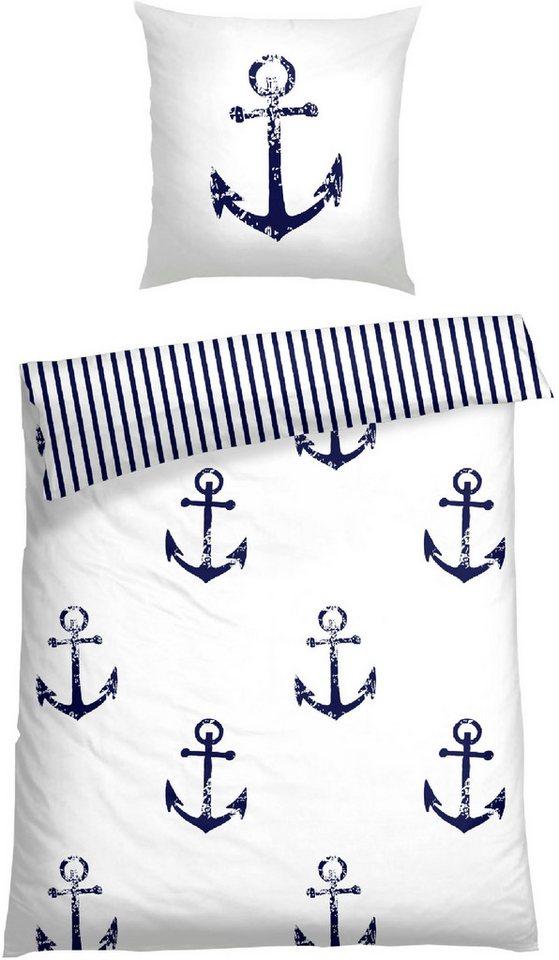 Weiche Wende-Bettwäsche im maritimen Look aus 100% reiner Baumwolle. Das Set umfasst einen Bettbezug in der Größe 135 x 200 cm und einen Kissenbezug mit 80 x 80 cm. Die atmungsaktive und temperaturausgleichende Qualität sorgt für ein angenehmes Schlafklima. Waschbar bis 60 Grad, kann gebügelt und getrocknet werden. Auf Schadstofffreiheit geprüft und zertifiziert. **Highlights** - Maritimer Look in Weiß und Marine - Atmungsaktiv, temperaturausgleichend und feuchtigkeitsregulierend - Waschbar bis 60 Grad - Hochwertiger Druck in feiner Renforcé-Qualität - Auf Schadstofffreiheit geprüft und zertifiziert **Produkteigenschaften** - Bettbezug: 135 x 200 cm - Kissenbezug: 80 x 80 cm - Material: 100% reine Baumwolle - Pflege: kann gebügelt und getrocknet werden **Lieferumfang** - 1 Bettbezug 135 x 200 cm - 1 Kissenbezug 80 x 80 cm - Bettbezug in der Größe 155 x 220 cm nicht enthalten
