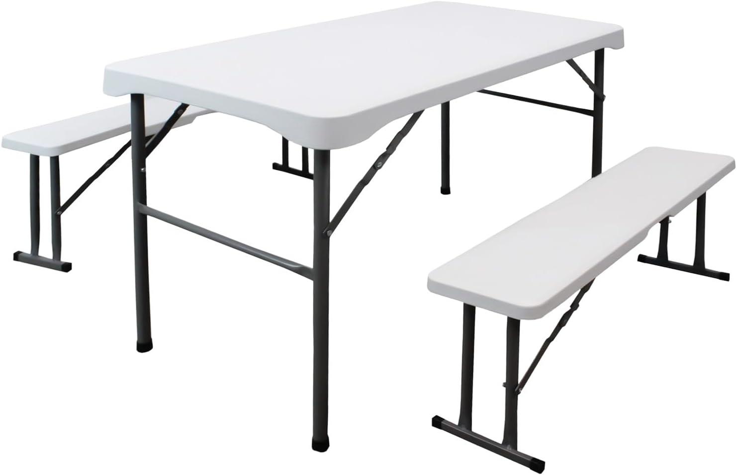 Die TRUTZHOLM Bierzeltgarnitur ist ein praktisches 3-teiliges Set, bestehend aus 2 Bänken und einem Tisch, das sich ideal für Garten, Terrasse oder Balkon eignet. Mit einer Tischlänge von 107 cm und einer stabilen Konstruktion aus pulverbeschichtetem Stahl und witterungsbeständigem Kunststoff bietet dieses Set ein echtes Biergartenfeeling. Es ist klappbar, platzsparend verstaubar und leicht zu transportieren. **Highlights** - Platzsparend: Bänke können unter dem Tisch befestigt werden - Leicht zu transportieren: verkürzte Version mit 107 cm Tischlänge - Stabile Konstruktion: Traglast je Bank ca. 150 kg - Witterungsbeständig und langlebig - Einfache Montage: Stahlgestell aufklappen, arretieren, fertig **Produkteigenschaften** - Maße Tisch aufgebaut: 107 x 59,5 x 71 cm - Maße je Bank aufgebaut: 87,5 x 19,5 x 40,5 cm - Gewicht Tisch: ca. 8 kg - Gewicht je Bank: ca. 3 kg - Material Gestell: Stahl, pulverbeschichtet - Material Oberfläche: Kunststoff (HDPE), weiß, Stärke ca. 65 mm - Herstellernummer: 4676 **Lieferumfang** - 1x Bierzeltgarnitur 3-teilig in weiß (2 Bänke + 1 Tisch)