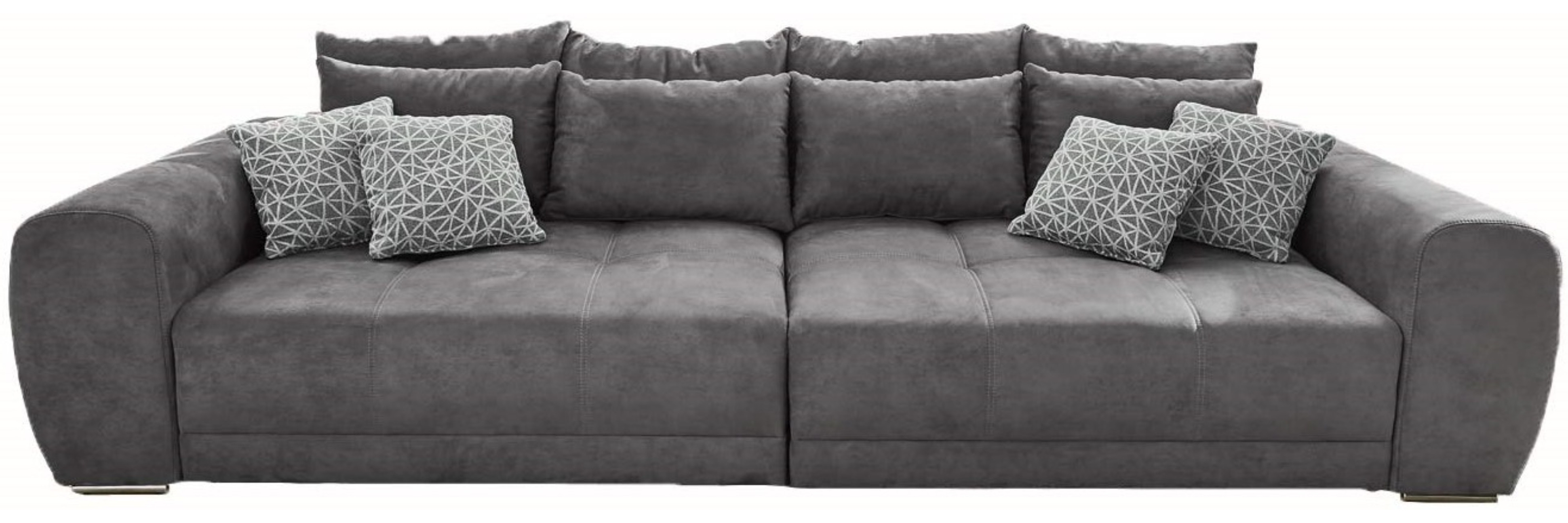 Dieses BIG-SOFA ist Ihre persönliche Wohlfühloase und bietet maximalen Kuschelfaktor. Mit einer Breite von 306 cm und einer Liegefläche von 120 x 240 cm ist es ideal für gesellige Abende. Der pflegeleichte Mikrofaserstoff und die hochwertige Federkernpolsterung garantieren einen angenehmen Sitz- und Liegekomfort. Die zahlreichen Kissen und die ansprechenden Steppungen machen dieses Sofa zum perfekten Mittelpunkt Ihres Wohnzimmers. **Highlights** - Pflegeleichter Mikrofaserstoff für einfache Reinigung - Hochwertige Federkernpolsterung für optimalen Komfort - 12 Kissen für zusätzlichen Kuschelfaktor - Rücken echt bezogen, frei im Raum stellbar - Metallfüße in chromfarbig für modernes Design **Produkteigenschaften** - Maße (HxBxT): 86 x 306 x 134 cm - Sitzhöhe: 39 cm - Sitztiefe (mit/ohne Kissen): 58/123 cm - Sitzbreite: 240 cm - Breite Armlehne: 33 cm - Höhe Armlehne: 60 cm - Liegefläche ohne Kissen: 120 x 240 cm - Bodenfreiheit: 3 cm - Textilkennzeichnung: Mikrofaserstoff 100 % Polyester, kleine Kissen Jaquard gemustert 43 % Polyester, 43 % Polyacryl, 14 % Baumwolle **Lieferumfang** - Big Sofa (ohne Hocker) - 4 große Kissen - 4 mittlere Kissen - 4 kleine Kissen - ohne evtl. zusätzlich abgebildete Dekorationen/Zubehörartikel/Ergänzungen