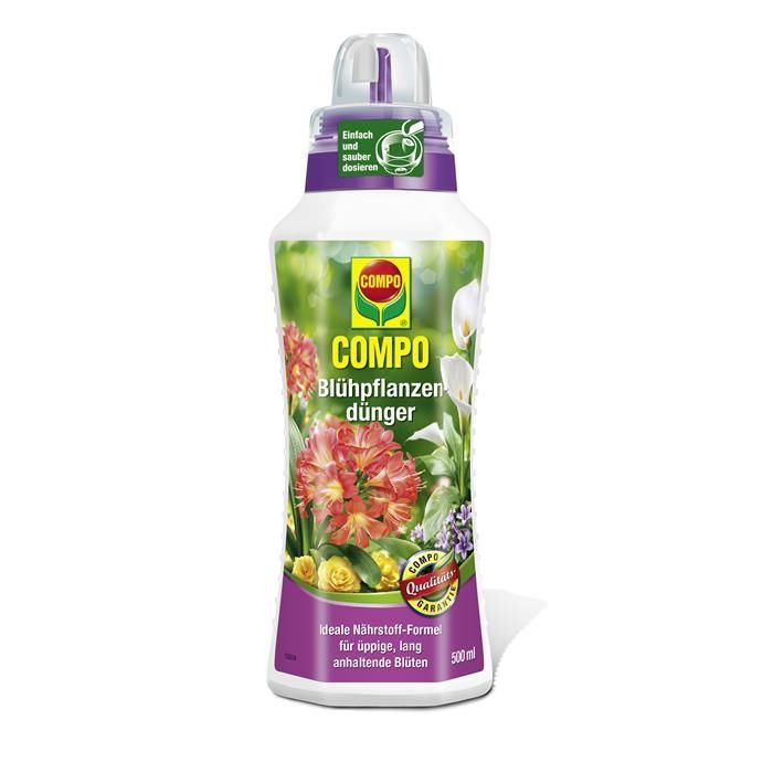 - Der COMPO Blühpflanzendünger ist eine flüssige Lösung, die vor Gebrauch geschüttelt und entsprechend der Dosierungsangaben mit Gießwasser verdünnt werden muss.