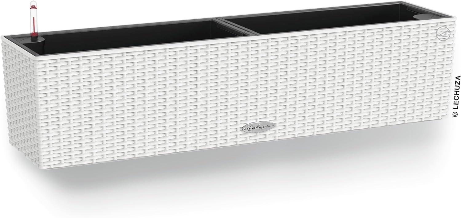 Die LECHUZA BALCONERA Cottage 80 in Weiß (Artikelnummer: 15610) ist ein hochwertiges Pflanzgefäß mit integriertem Bewässerungssystem. Das Original LECHUZA-Bewässerungssystem sorgt dafür, dass Ihre Pflanzen immer die richtige Menge Wasser erhalten. Mit dem praktischen Wasserstandsanzeiger behalten Sie die Gießkontrolle. Das Pflanzgefäß eignet sich sowohl für den Innen- als auch für den Außenbereich und ermöglicht Ihnen eine unkomplizierte Pflanzenpflege das ganze Jahr über. Dank des Bewässerungssystems und der Bodenschraube kann überschüssiges Regenwasser problemlos abfließen. Die LECHUZA BALCONERA Cottage 80 wird in Deutschland hergestellt und besteht aus hochwertigem, UV- und witterungsbeständigem Kunststoff. Das Material ist zu 100% recycelbar, langlebig und bruchsicher. Das Pflanzgefäß besticht durch seine robuste Flechtoptik, die einen rustikalen und charmanten Landhaus-Flair in Ihren Garten, auf Ihre Terrasse oder auf Ihren Balkon bringt. Die LECHUZA BALCONERA Cottage 80 ist in verschiedenen Farben und Größen erhältlich und überzeugt durch ihre Robustheit, Pflegeleichtigkeit und Langlebigkeit. **Highlights** - Integriertes Bewässerungssystem: Versorgt Pflanzen zuverlässig mit der richtigen Menge Wasser - Wasserstandsanzeiger: Ermöglicht eine einfache Gießkontrolle - Für Innen & Außen geeignet: Unkomplizierte Pflanzenpflege das ganze Jahr über - Robuste Flechtoptik: Bringt rustikalen Landhaus-Flair in Ihren Garten, auf Ihre Terrasse oder auf Ihren Balkon - Made in Germany: Hochwertiger, UV- und witterungsbeständiger Kunststoff, zu 100% recycelbar, langlebig und bruchsicher **Produkteigenschaften** - Material: Kunststoff - Maße: 79 x 19 x 19 cm - Pflanzeinsatz: 15,5 x 36,6 x 2 cm Stk. - Wasserspeicher: 5 l - Pflanzvolumen: 12 l **Lieferumfang** - 1x Pflanzgefäß BALCONERA Cottage - Inklusive Bewässerungssystem - Pflanzsubstrat LECHUZA-PON als Drainageschicht - Wechselbarer Pflanzeinsatz mit versenkbaren Griffen und Wasserstandsanzeiger