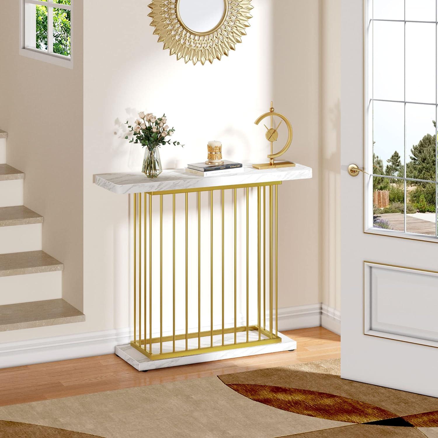 Der YITAHOME Konsolentisch in Gold vereint Stabilität und Stil. Hergestellt aus hochwertigem MDF und Eisen, bietet er eine Tragfähigkeit von bis zu 36 kg. Mit verstellbaren Füßen ist er ideal für kleine Räume und vielseitig einsetzbar. Das elegante Design mit Marmorplatte und goldenen Beinen fügt sich harmonisch in Ihr Zuhause ein. **Highlights** - Stabil und langlebig: Hergestellt aus hochwertigem MDF und Eisen - Vielseitige Verwendung: Perfekt für Wohnzimmer, Schlafzimmer, Küche und mehr - Multifunktional: Kann als Konsolentisch, Pflanzenständer oder Beistelltisch genutzt werden - Stilvolles Design: Kombination aus Marmorplatte und goldenen Beinen - Einfache Montage: Mit bebildeter Anleitung für schnellen Aufbau **Produkteigenschaften** - Maße: 30 D x 100 W x 82 H Zentimeter - Material: CARB P2-konformes MDF, Eisen - Tragfähigkeit: bis zu 36 kg - Verstellbare Füße für stabilen Stand - Geeignet für Eingangsbereich, Flur, Wohnzimmer - Klassisches Design mit erhöhtem Linienmuster **Lieferumfang** - 1 x Konsolentisch - Montageanleitung
