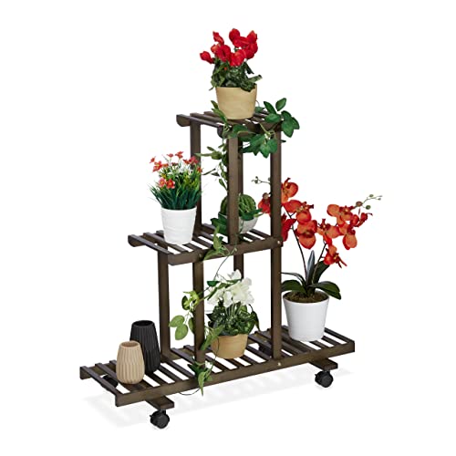 in BlumenständerRelaxdays PflanzenregalBlumenständer mit 3 Ablagen, Bambus, HxBxT 82 x 81 x 36 cm, rollbar, Blumenregal innen, braun