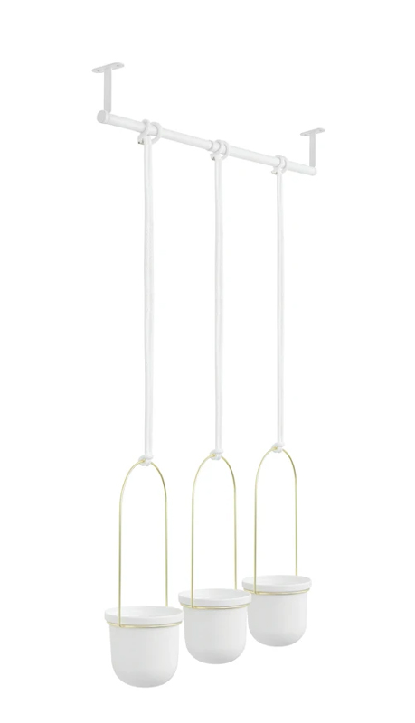 Die Umbra Triflora ist ein modernes Hängetopf-Trio, das an der Wand befestigt wird und zusätzlichen Platz für Pflanzen bietet. Es handelt sich hierbei um eine elegante Lösung für alle, die ihren Wohnbereich mit grünen Akzenten bereichern möchten. Die Verarbeitungsqualität ist hochwertig und das Montagematerial solide. Dank individuell verstellbarer Kordeln lässt sich die Vase einfach montieren.