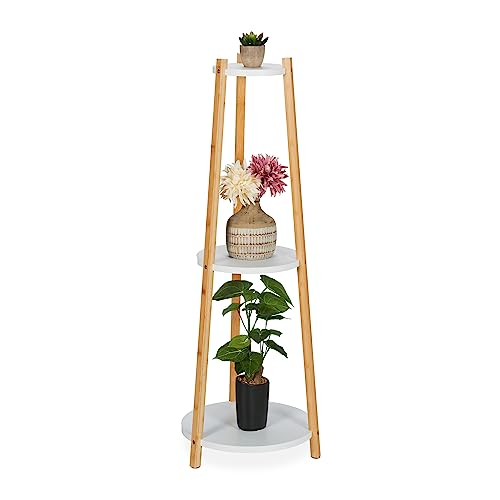 in BlumenständerRelaxdays Pflanzenständer3 Ablagen, rund, Blumenständer für innen, Bambus, MDF, HxD: 98x35 cm, Blumenregal, weiß/Natur
