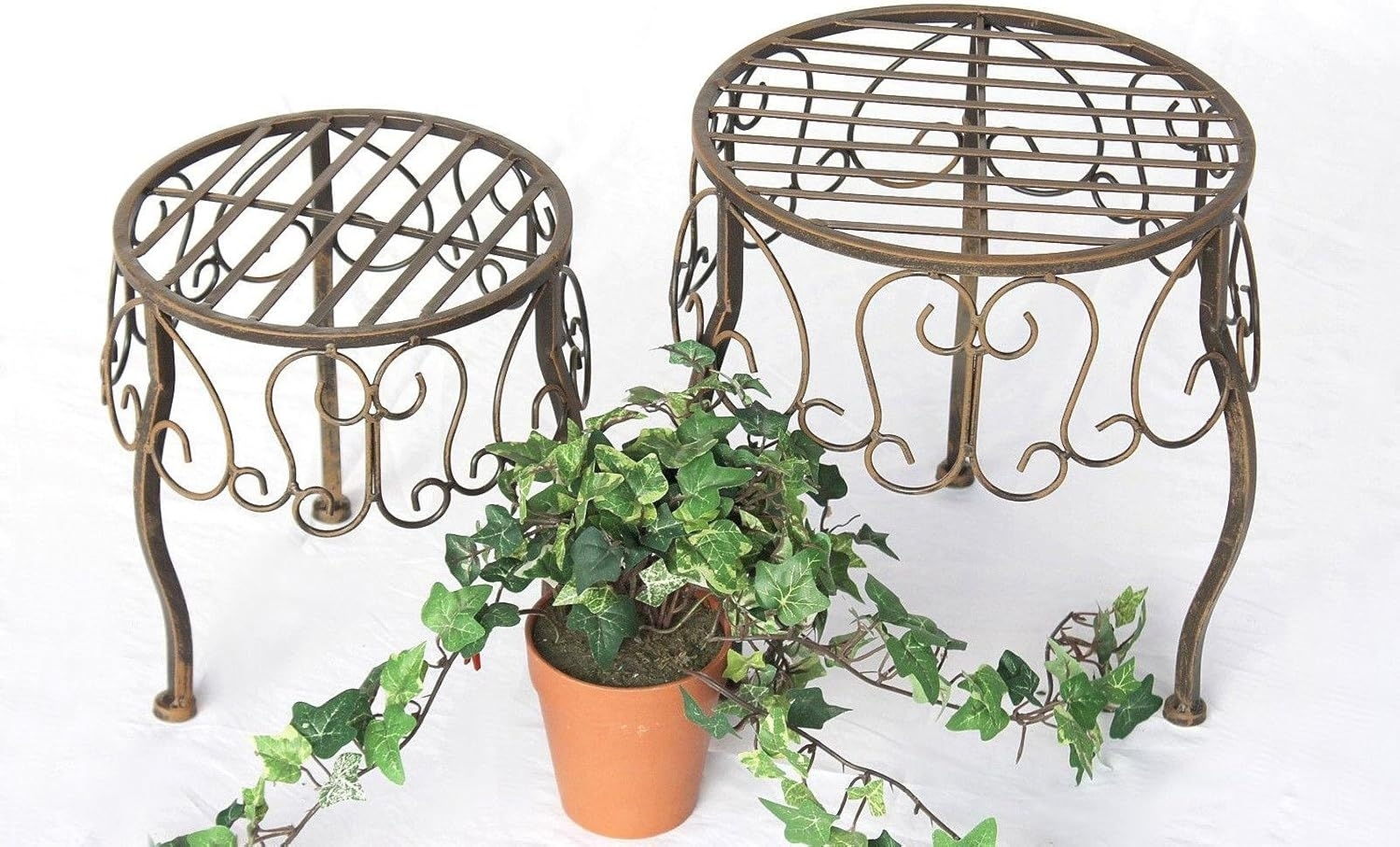 Stilvolles 2er Set Blumenhocker aus geschmiedetem Metall in antikbrauner Farbe. Diese stabilen und dekorativen Hocker bieten Ablageflächen für Pflanzen, Blumentöpfe oder Vasen und können auch als Beistelltische in verschiedenen Räumen eingesetzt werden. Mit Höhen von 25 cm und 30 cm sowie Durchmessern von 22 cm und 27 cm sind sie vielseitig einsetzbar. **Highlights** - Stabil und dekorativ - Aus geschmiedetem Metall - Aufwändig verziert - Vielseitig einsetzbar als Blumenständer oder Beistelltisch - Antikbraune Farbe **Produkteigenschaften** - Maße: Höhe 25 cm und 30 cm - Durchmesser 22 cm und 27 cm - Material: Metall **Lieferumfang** - 2x Blumenhocker