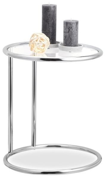 - Der Beistelltisch hat eine runde Platte aus gehärtetem Glas und zwei Standrohren aus glänzendem Edelstahl.