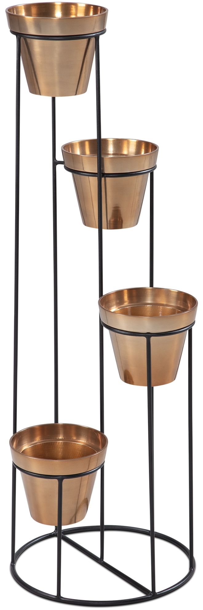 Praktischer Blumenständer im modernen Design mit vier Blumentöpfen auf unterschiedlichen Höhen. Der harmonische Farbmix aus Schwarz und Gold verleiht ihm eine edle Optik. Die Abmessungen betragen 40 cm in der Breite, 109 cm in der Höhe und 40 cm in der Tiefe. Jeder Topf hat Innenabmessungen von 19 x 15 cm (Ø x H). Die Töpfe sind aus lackiertem Aluminium und das Gestell aus pulverbeschichtetem Eisen gefertigt. Jedes Stück ist handgefertigt und somit ein Unikat. **Highlights** - Modernes Design mit vier Blumentöpfen auf unterschiedlichen Höhen: Schafft eine ansprechende Optik und ermöglicht eine vielseitige Bepflanzung. - Harmonischer Farbmix aus Schwarz & Gold: Verleiht dem Pflanzenständer eine edle und moderne Ausstrahlung. - Handgefertigt als Unikat: Jedes Stück wurde mit Liebe zum Detail gefertigt und ist somit einzigartig. - Leicht herausnehmbare Töpfe: Ermöglicht eine einfache Pflege und Bepflanzung der Blumentöpfe. - Empfohlene Maximalbelastbarkeit pro Blumentopf: 5 kg: Sorgt für Stabilität und Sicherheit bei der Bepflanzung. **Produkteigenschaften** - Maße: Breite: 40 cm, Höhe: 109 cm, Tiefe: 40 cm, Innenabmessungen je Topf (Ø x H): 19 x 15 cm - Material: Kübel aus lackiertem Aluminium, Gestell aus pulverbeschichtetem Eisen **Lieferumfang** - Ein Blumenregal mit 4 Töpfen ohne Dekoration